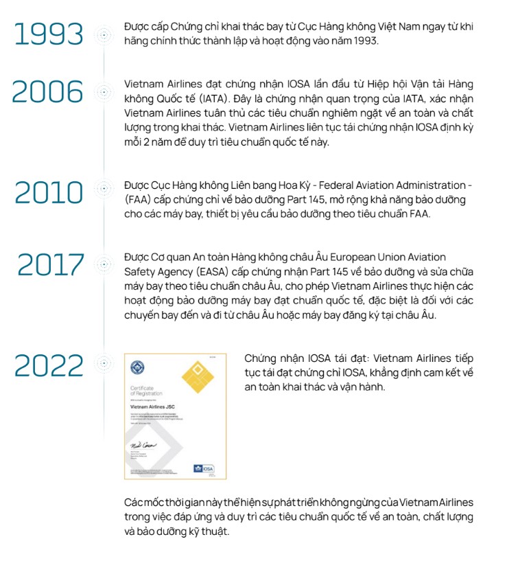 Với những nỗ lực không ngừng trong việc tuân thủ tiêu chuẩn quốc tế, phát triển bền vững và nâng cao chất lượng dịch vụ, Vietnam Airlines đã và đang khẳng định vị thế hàng không quốc gia, xứng đáng là lựa chọn hàng đầu cho hành khách trong và ngoài nước. Hãng sẽ tiếp tục nỗ lực để mang đến những trải nghiệm bay an toàn, thoải mái và đẳng cấp nhất cho khách hàng.