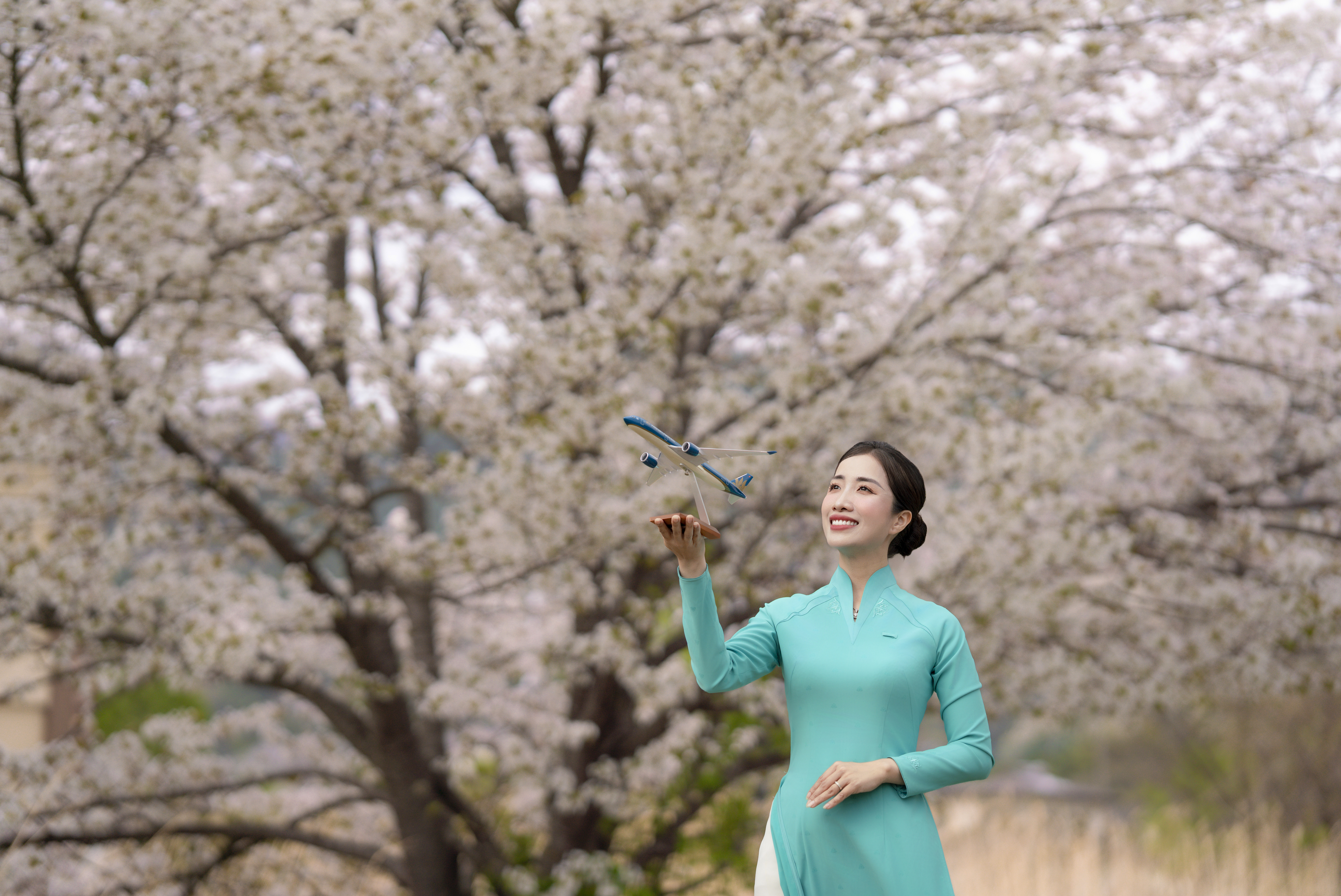 Hình ảnh cô tiếp viên việt nam airlines mặc áo dài checkin cùng biểu tượng núi phú sĩ và hoa anh đào thật đẹp.