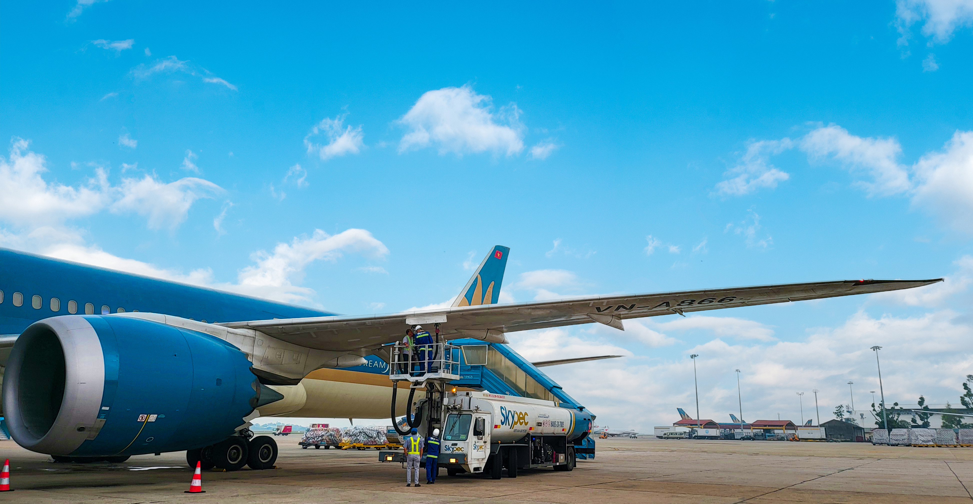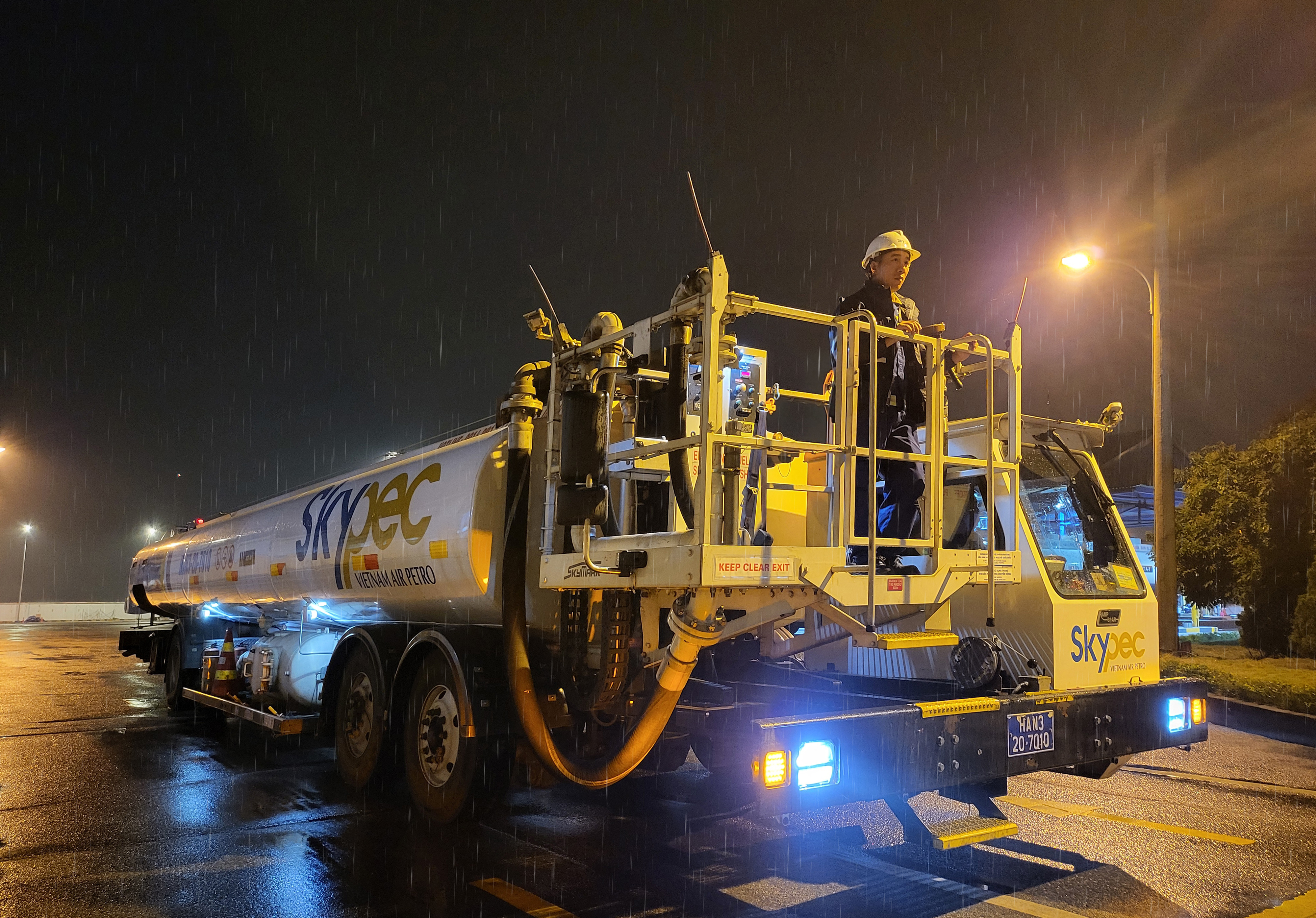 Chiếc xe tra nạp mang thương hiệu Skypec tiếp cận sát cánh máy bay, nhân viên kỹ thuật làm việc phối hợp nhịp nhàng, tuân thủ nghiêm ngặt quy trình tra nạp.