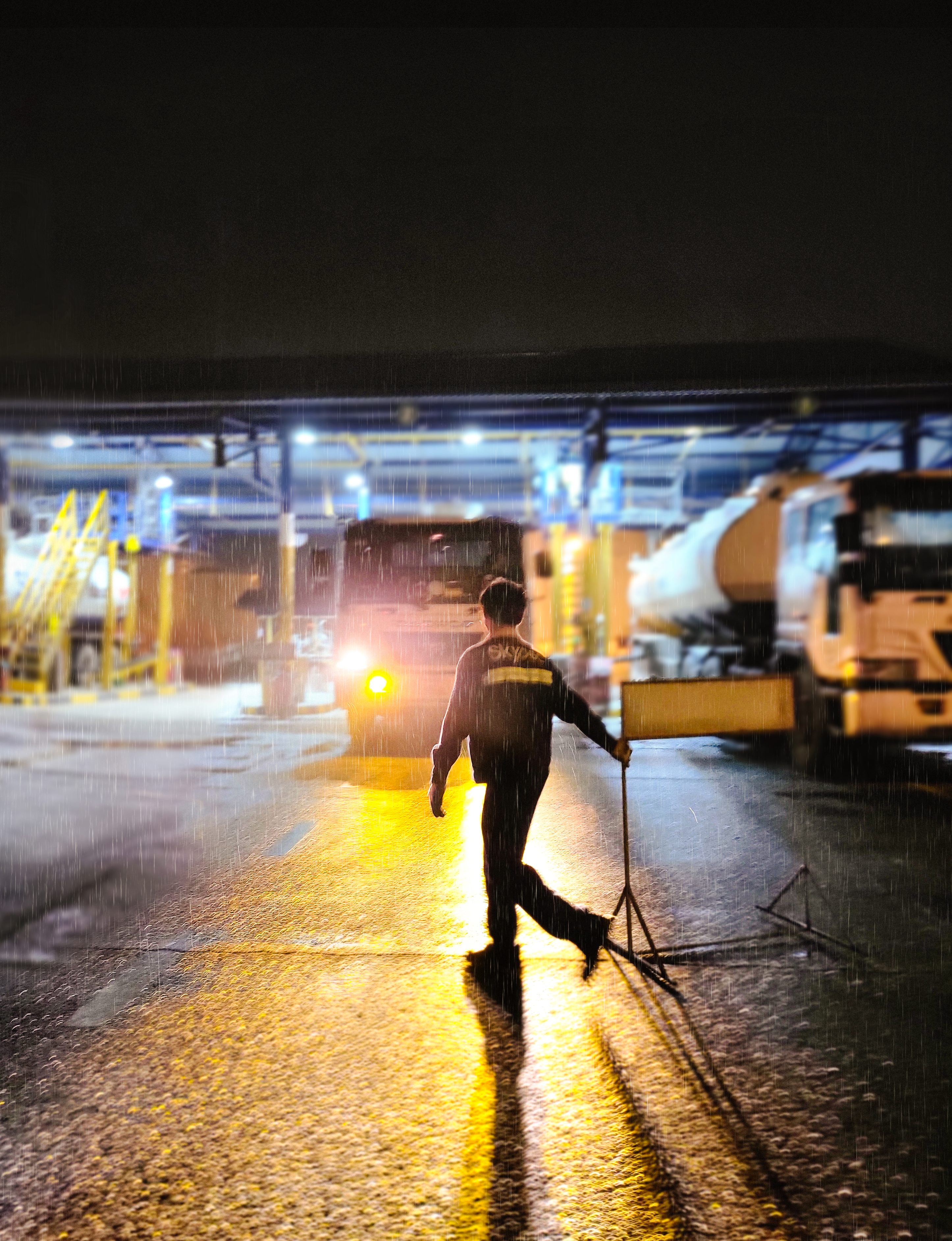 Dưới cơn mưa giao mùa là hình ảnh người nhân viên bảo quản kéo biển “STOP” để hướng dẫn xe bồn vào giàn nhập dầu. Ánh đèn pha hắt bóng in dài trên nền đường ướt, làm nổi bật dáng người lao động tận tụy giữa đêm khuya.