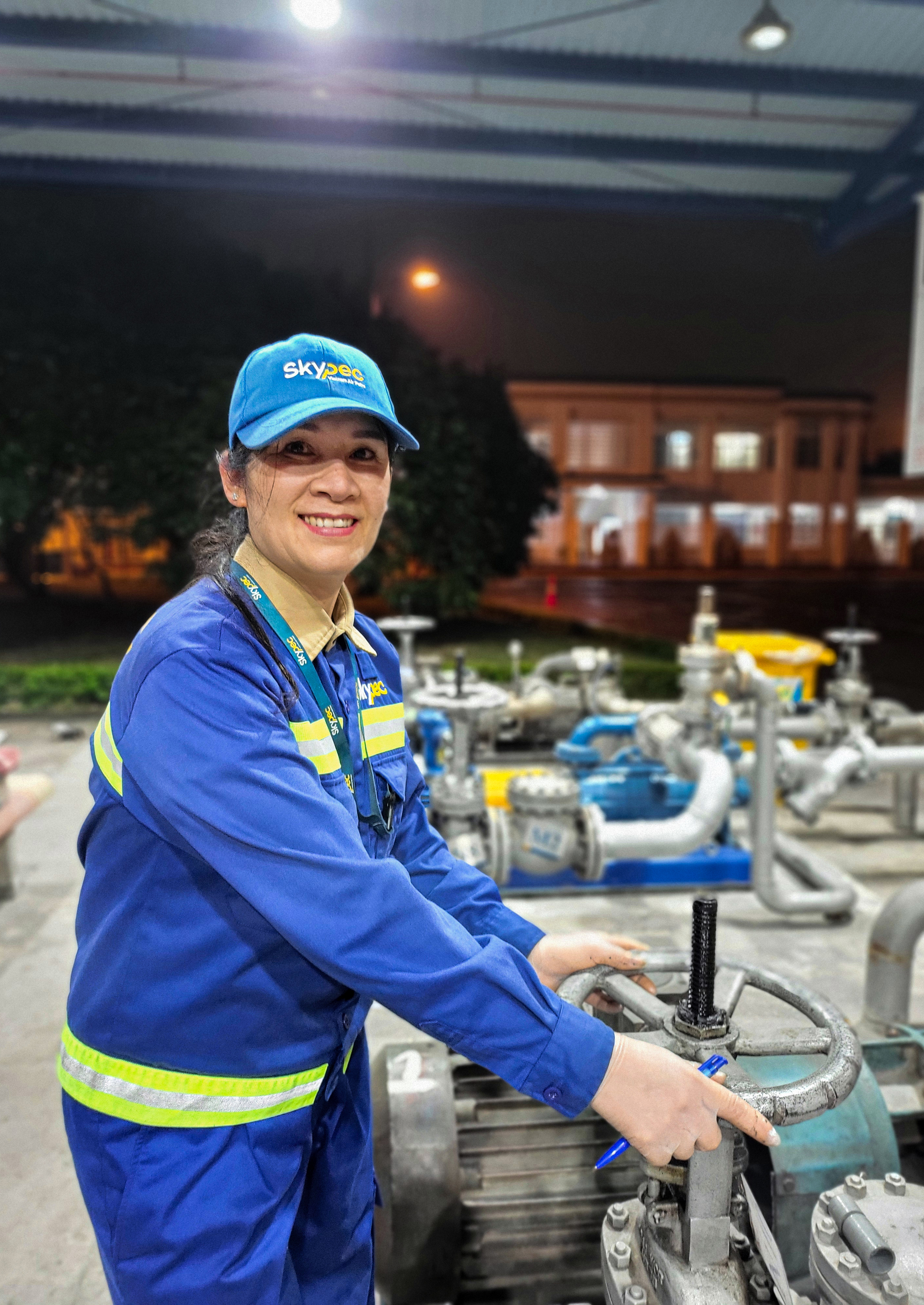 Nụ cười rạng rỡ của nữ nhân viên vận hành máy bơm dầu đã lan tỏa nguồn năng lượng tích cực,lạc quan khi phải làm việc xuyên đêm.