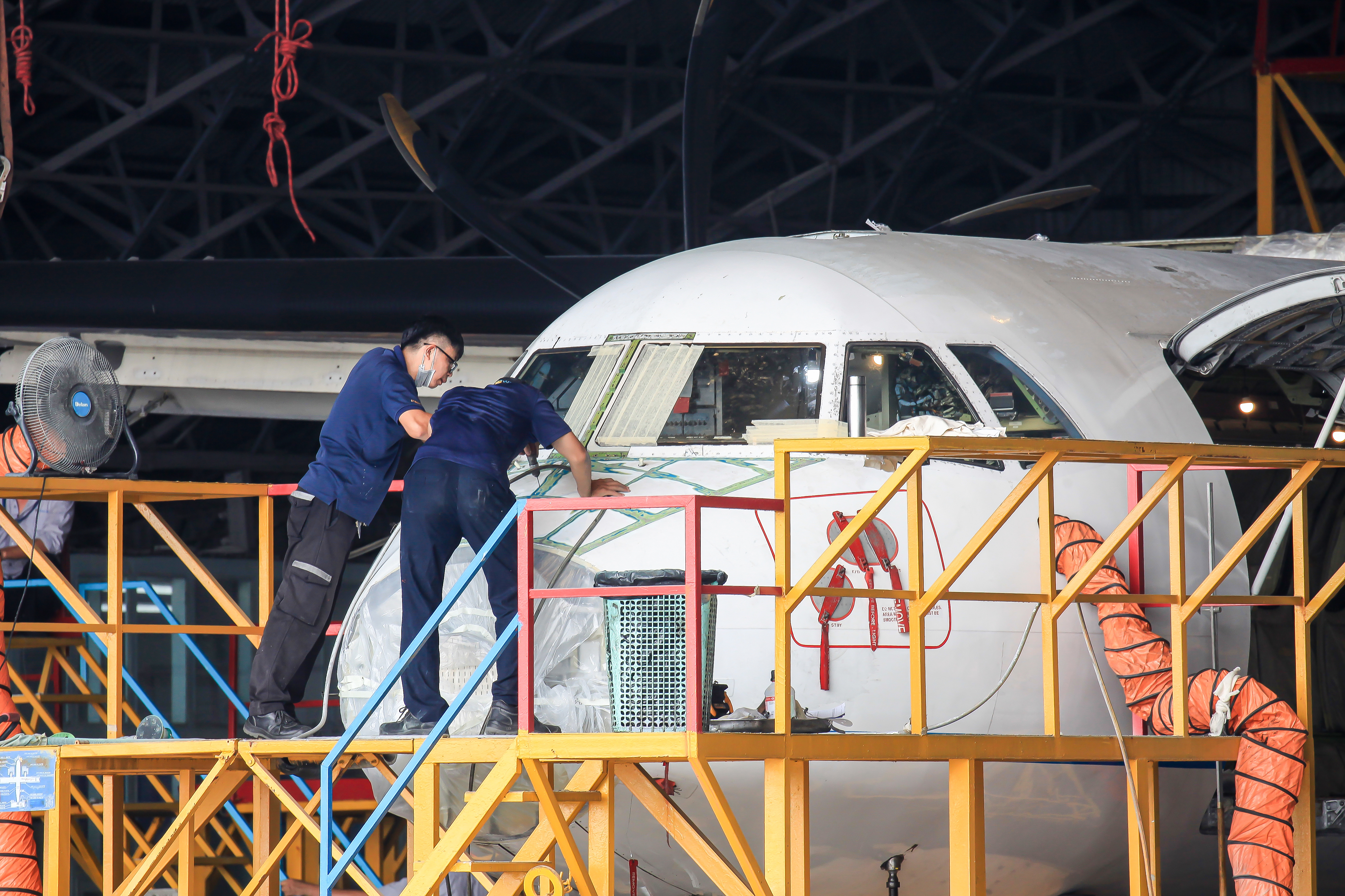 Các kỹ thuật viên đang thực hiện bảo trì một máy bay ATR-72 của VASCO, đảm bảo mọi chi tiết đều được kiểm tra trước khi khởi hành.