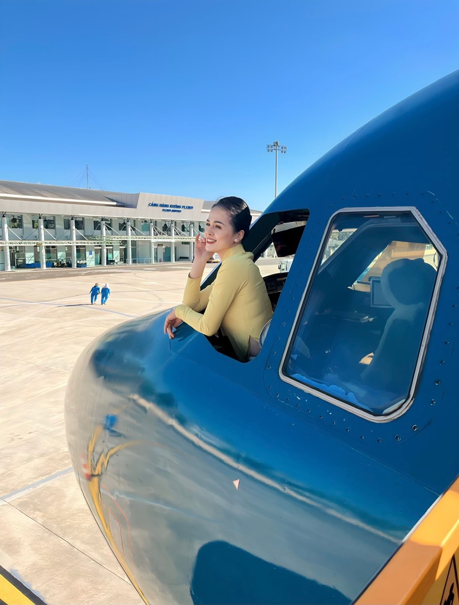 Bức ảnh thứ hai ghi lại hình ảnh của tôi, một tiếp viên trưởng của Vietnam Airlines, trong tà áo dài màu vàng rực rỡ, duyên dáng bên cửa sổ buồng lái máy bay. Chiếc máy bay ấy cũng là một chiếc thuộc gia đình Airbus A320, như một sự trùng hợp đầy ý nghĩa với chiếc máy bay mà bố tôi đã từng tận tâm bảo dưỡng.