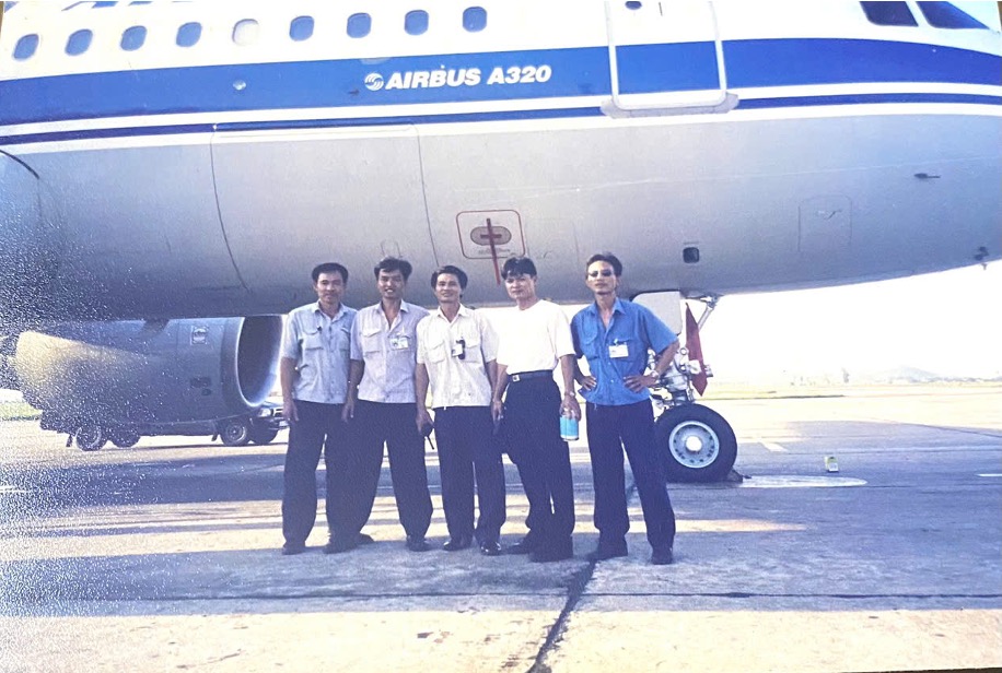 Bức ảnh đầu tiên ghi lại khoảnh khắc đáng nhớ của bố tôi, một người thợ bảo dưỡng máy bay đầy tâm huyết, đứng giữa những người đồng nghiệp thân thiết thuộc đội bảo dưỡng của Vietnam Airlines.