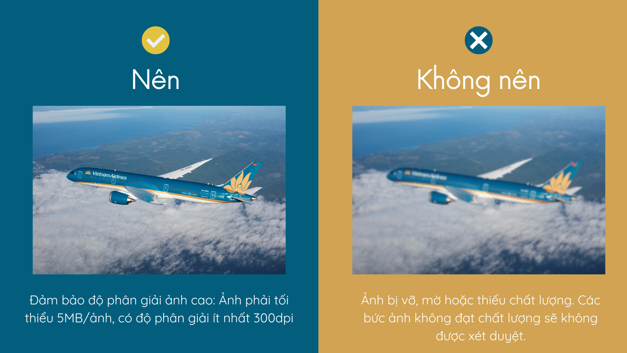 Đảm bảo ảnh có độ phân giải ít nhất 300dpi và dung lượng không dưới 5MB.