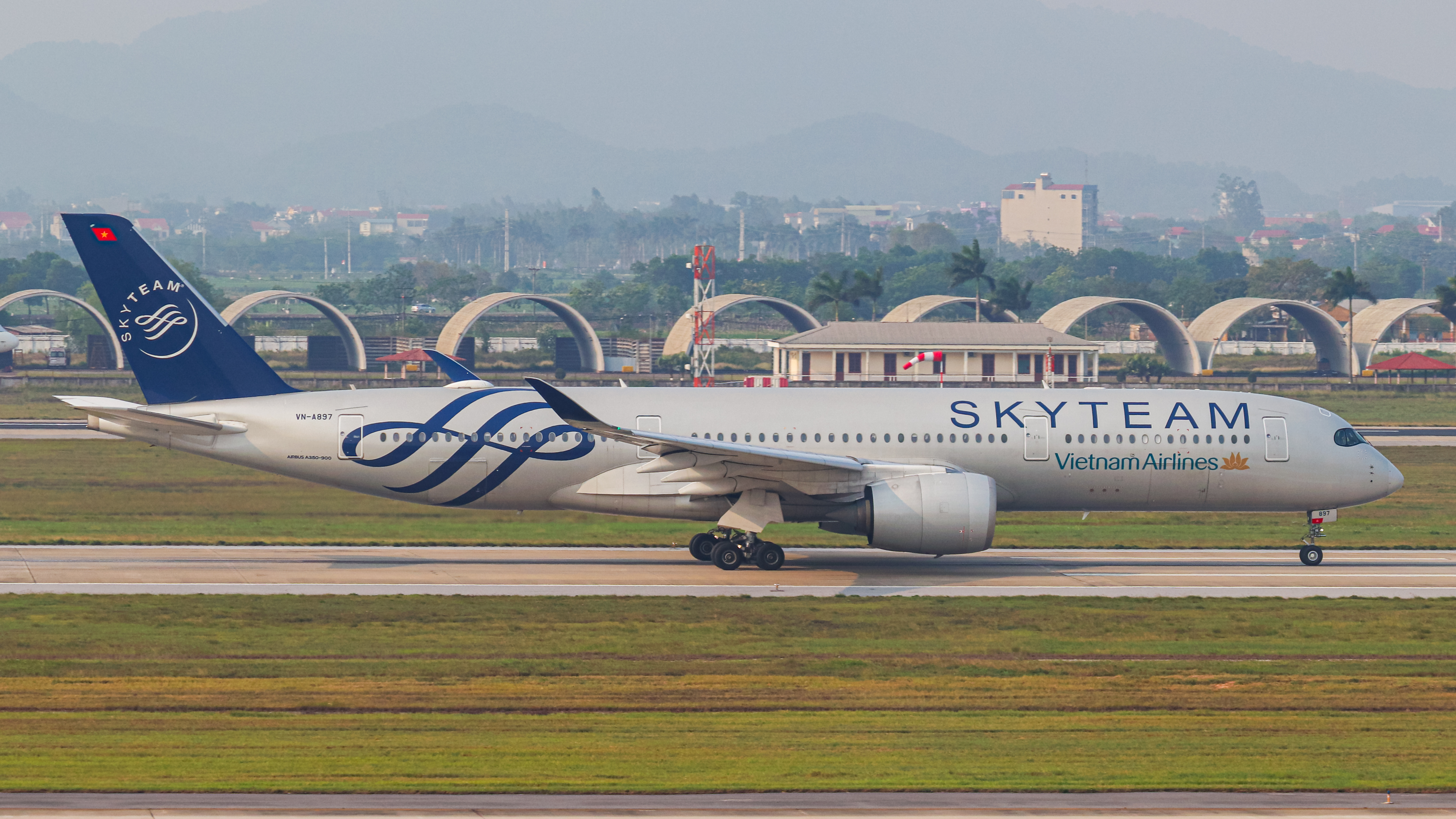 Ảnh 1 : Tàu bay Airbus A350 của Vietnam Airlines chuẩn bị cất cánh mang màu sơn ” Skyteam ” đặc biệt duy nhất trên thế giới