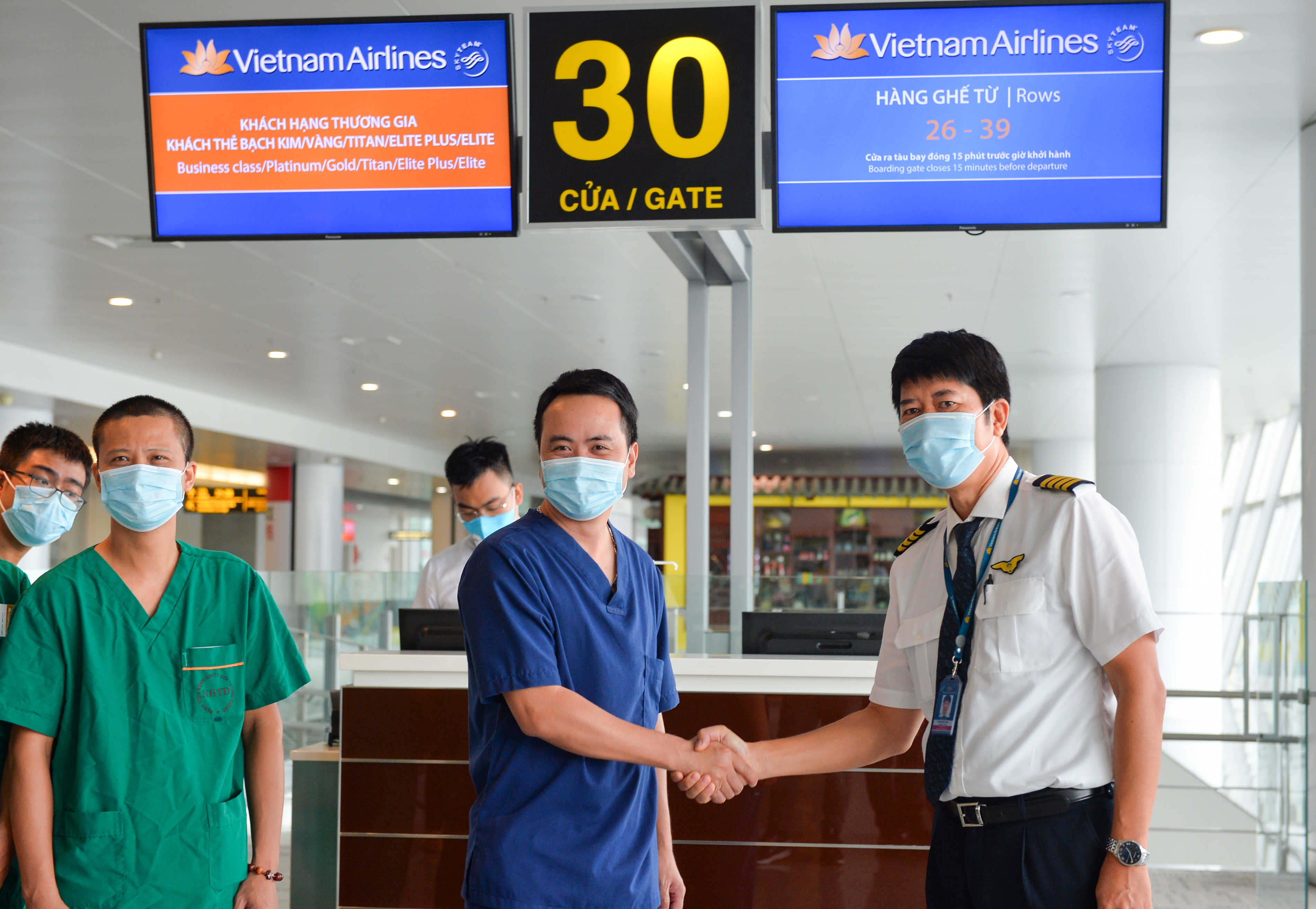 Cơ trưởng Phạm Đình Hưng, đoàn phó đoàn bay A350 – phụ trách chuyến bay bắt tay cùng bác sỹ Thân Mạnh Hùng (Phó Trưởng khoa Cấp cứu) trưởng đoàn y tế. Đây là chuyến bay mà ai cũng tâm niệm là “mệnh lệnh của trái tim”.