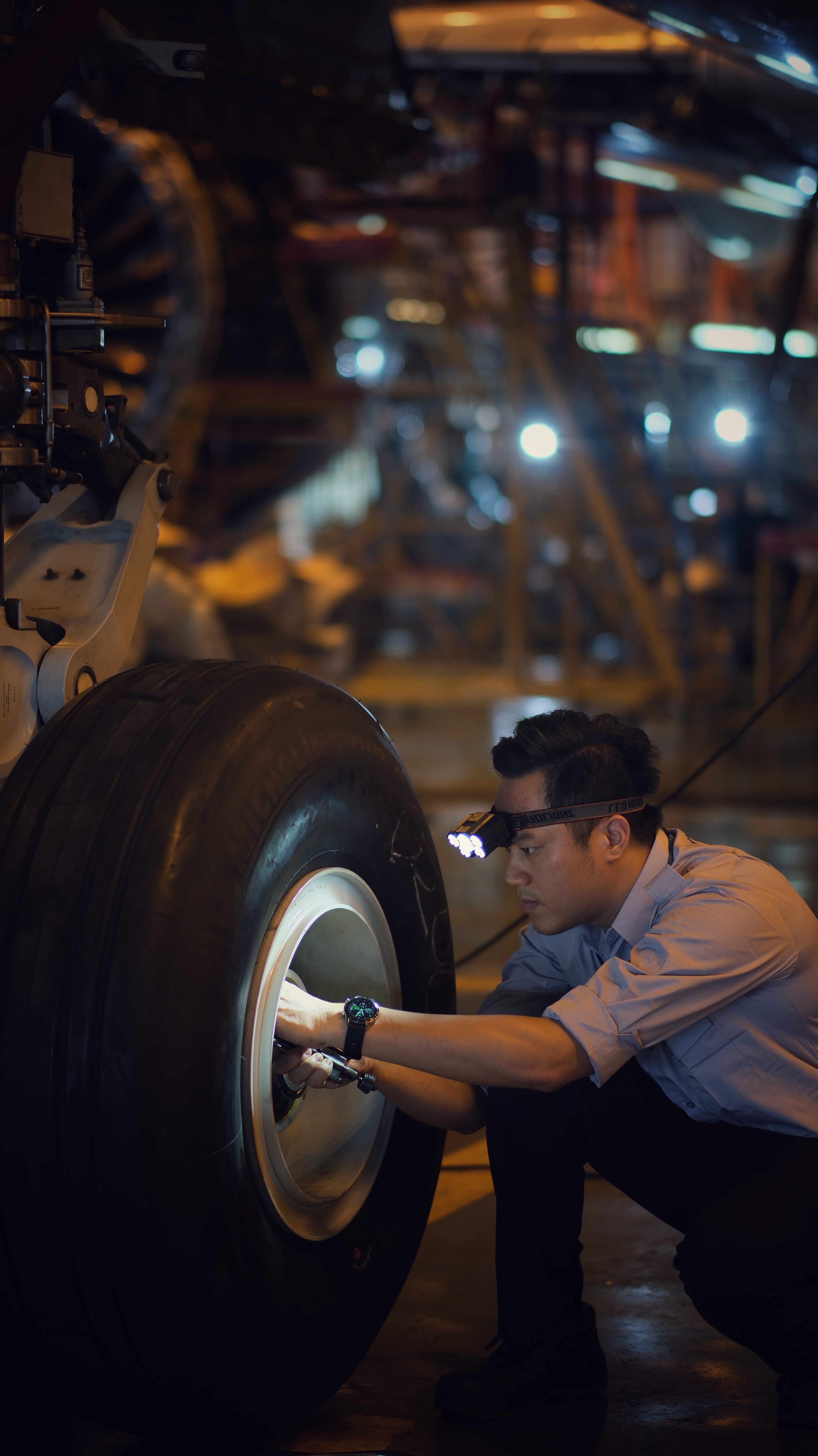 Ánh sáng yếu ớt từ chiếc đèn pin rọi lên gương mặt đầy tập trung của người kỹ sư, đôi tay họ nhẹ nhàng nhưng đầy chắc chắn, chăm chút từng chi tiết nhỏ nhất trên máy bay.