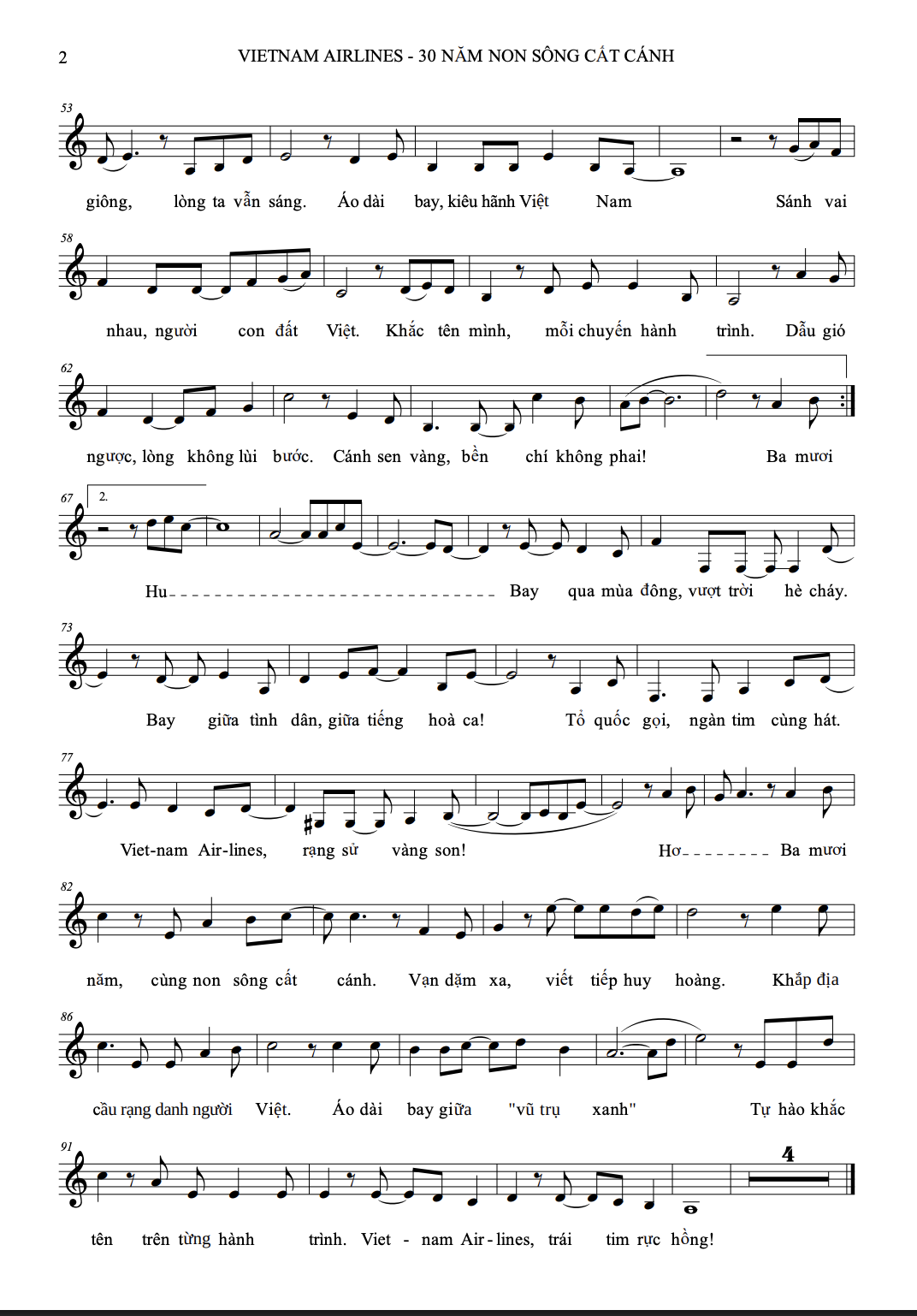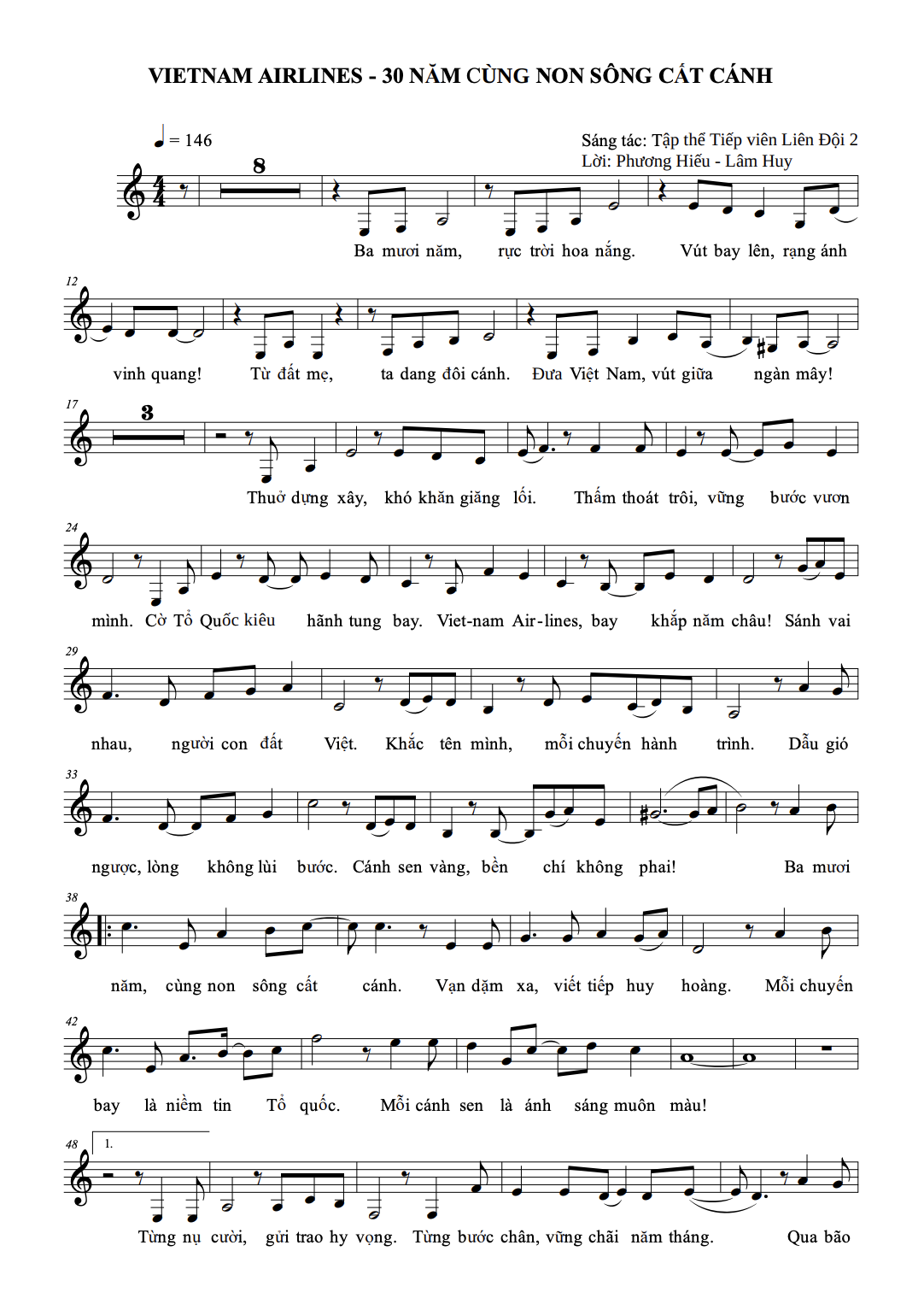 Nhân dịp kỷ niệm 30 năm thành lập và phát triển của Tổng công ty Hàng không Việt Nam – Vietnam Airlines, tập thể tiếp viên Liên đội 2 đã chung tay sáng tác ca khúc “Vietnam Airlines – 30 năm cùng non sông cất cánh” như một món quà tinh thần gửi gắm niềm tự hào, lòng tri ân và khát vọng vươn xa.