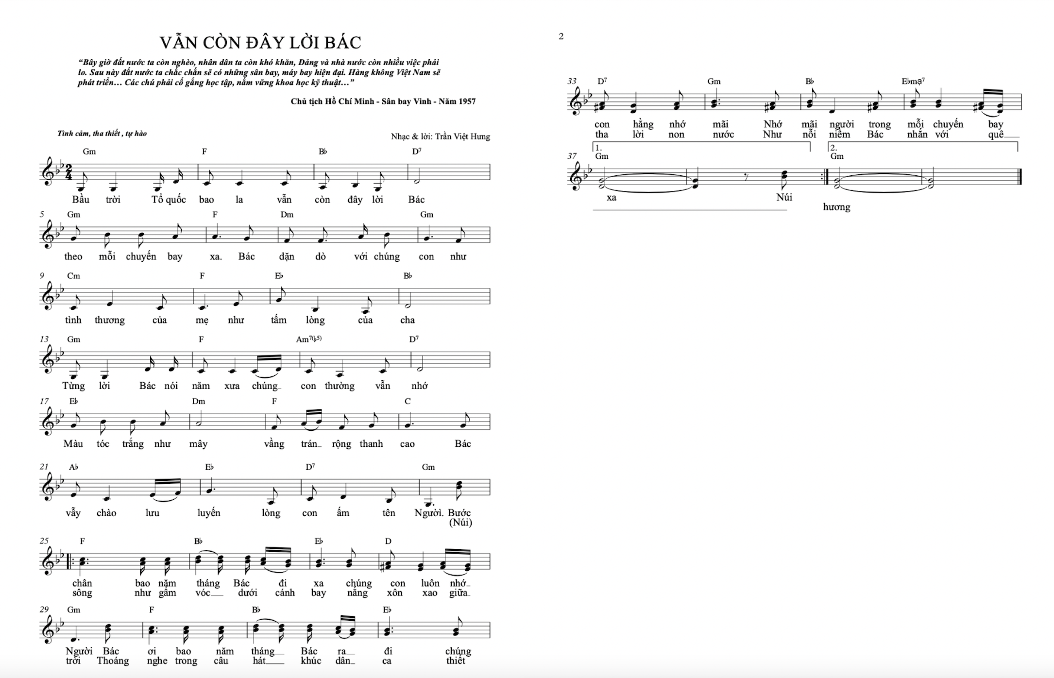 Tình cờ được đọc lại những dòng chữ thiêng liêng ấy trong một lần đi họp tại Đoàn bay 919, là một người nhạc sĩ – tôi thấy xúc động rất sâu sắc. Những tứ nhạc đầu tiên của ca khúc “Vẫn còn đây lời Bác” bắt đầu hình thành từ đó.