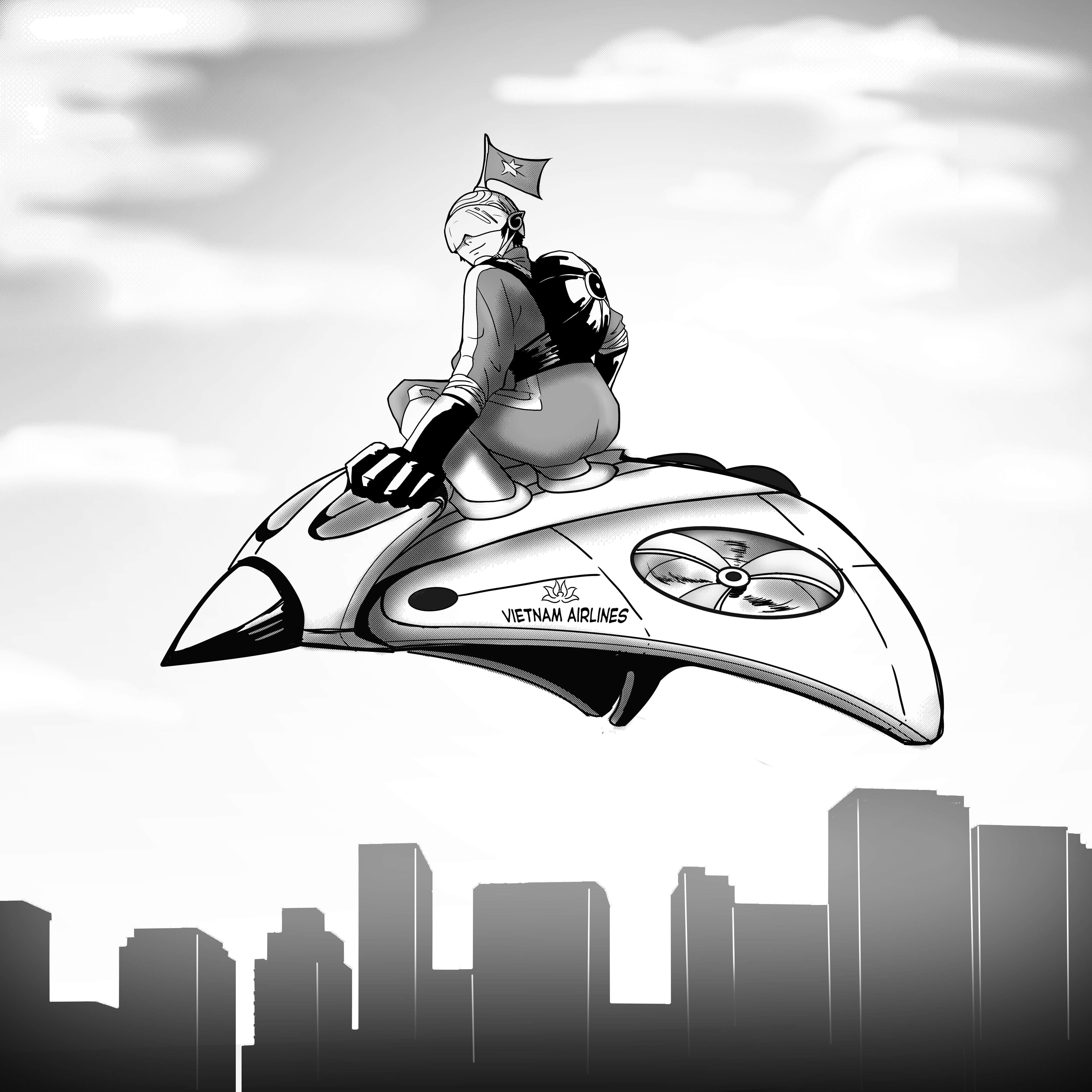 Bức tranh đầu tiên phác họa một viễn cảnh táo bạo: trong tương lai, Vietnam Airlines không chỉ dừng lại ở vai trò của một hãng hàng không quốc gia, mà còn trở thành nhà tiên phong sản xuất phương tiện bay cá nhân. Hình ảnh chiếc “Cánh diều xanh” lướt nhẹ trên bầu trời đô thị gợi lên cảm giác vừa quen vừa lạ – quen bởi dáng dấp gắn liền với biểu tượng hoa sen vàng, lạ bởi nó mang trong mình khát vọng dân chủ hóa bầu trời, đưa việc “bay” trở thành trải nghiệm gần gũi cho mọi người.