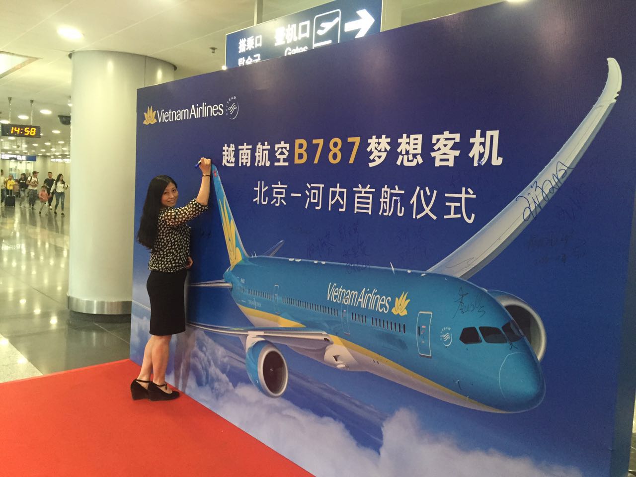 Ngày 30/4/2016, Vietnam Airlines tổ chức lễ khai trương đường bay đầu tiên sử dụng tàu bay B787 từ Bắc Kinh đến Hà Nội tại Nhà ga T2 – Sân bay Quốc tế Thủ đô Bắc Kinh. Đó là một dấu ấn không thể quên trong sự nghiệp của tôi. Việc Boeing 787-9 Dreamliner chính thức khai thác tuyến bay Bắc Kinh – Hà Nội không chỉ là cột mốc phát triển quan trọng của hãng, mà còn là giây phút đầy tự hào đối với cá nhân tôi. Nhìn chiếc Dreamliner mới tinh lướt nhẹ ra đường băng và cất cánh giữa bầu trời xanh thẳm, trong lòng tôi ngập tràn cảm xúc.