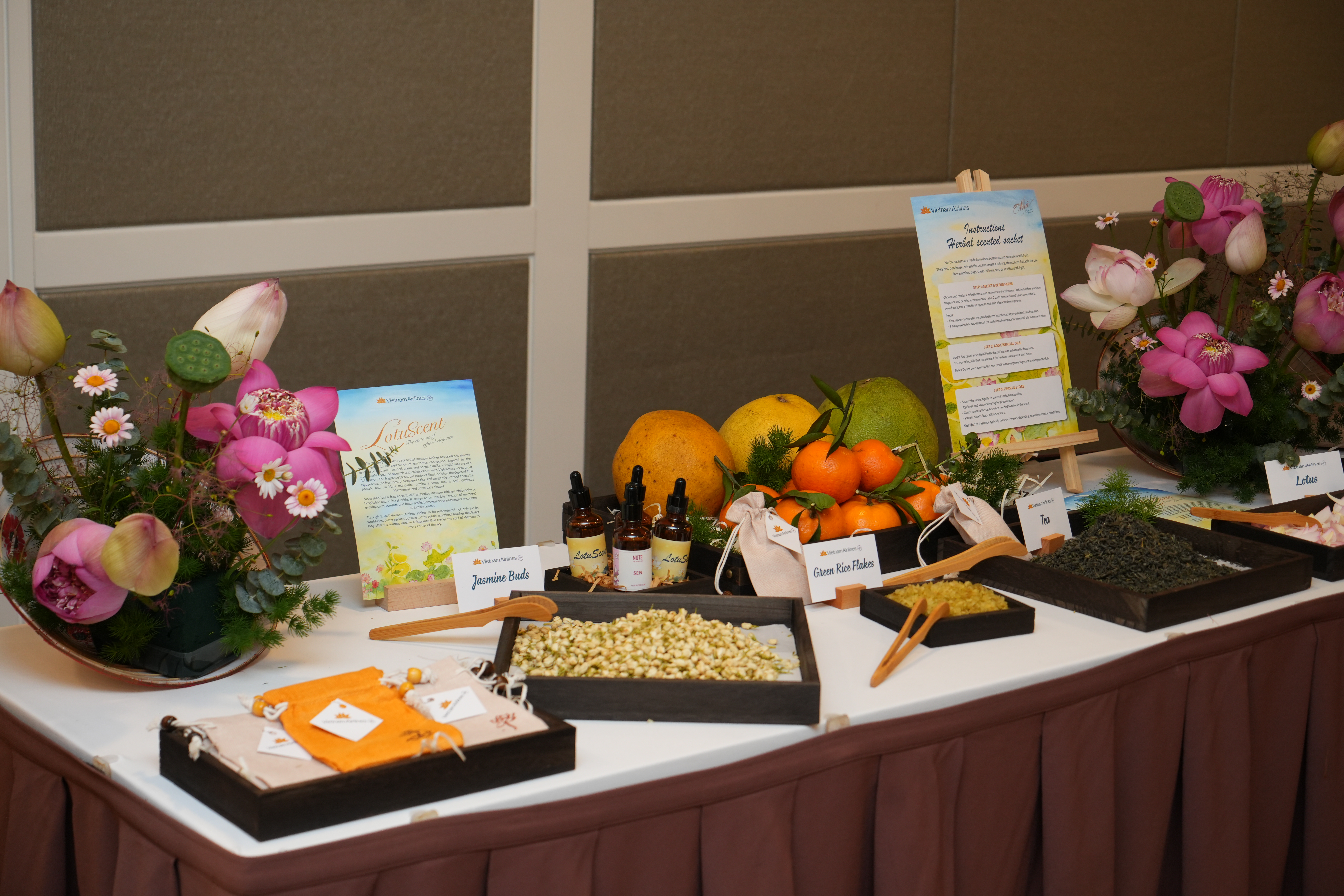 Trải nghiệm làm túi thơm từ mùi hương thương hiệu “Nhã” (LotuScent) của Vietnam Airlines tạo điểm nhấn thú vị tại sự kiện, thu hút các đại biểu và khách mời tham gia.