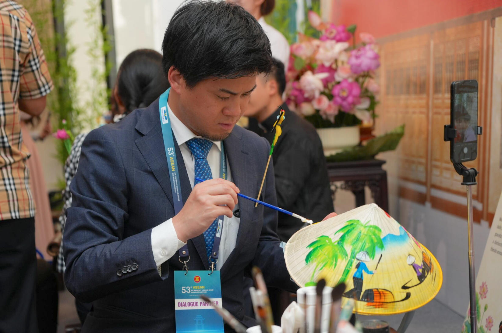 Các khu vực trải nghiệm văn hóa được bố trí xuyên suốt không gian Gala. Hoạt động vẽ nón lá mang đến trải nghiệm thủ công truyền thống, giúp đại biểu khám phá nét đẹp văn hóa Việt Nam một cách trực quan.