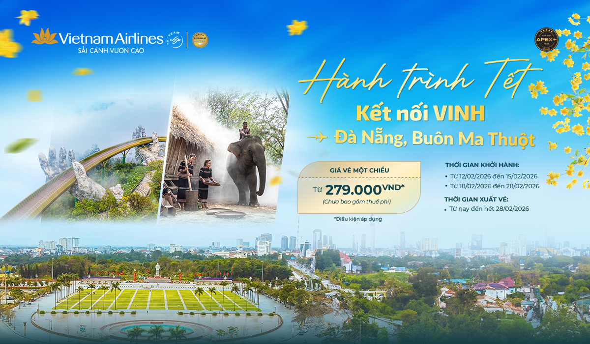 Với mức giá hấp dẫn chỉ từ 279.000 VNĐ (chưa bao gồm thuế và phí), quý khách sẽ sở hữu ngay chiếc vé một chiều đi từ Vinh đến Đà Nẵng và Buôn Ma Thuột. Chương trình áp dụng cho thời gian xuất vé từ nay đến hết ngày 28/02/2026. Hiệu lực khởi hành được linh hoạt chia làm hai giai đoạn: từ ngày 12/02/2026 đến 15/02/2026 và từ ngày 18/02/2026 đến 28/02/2026.