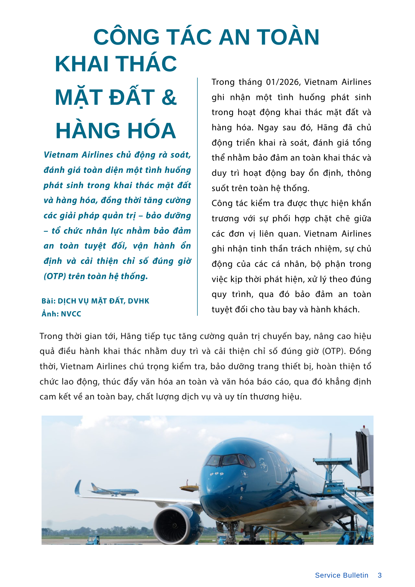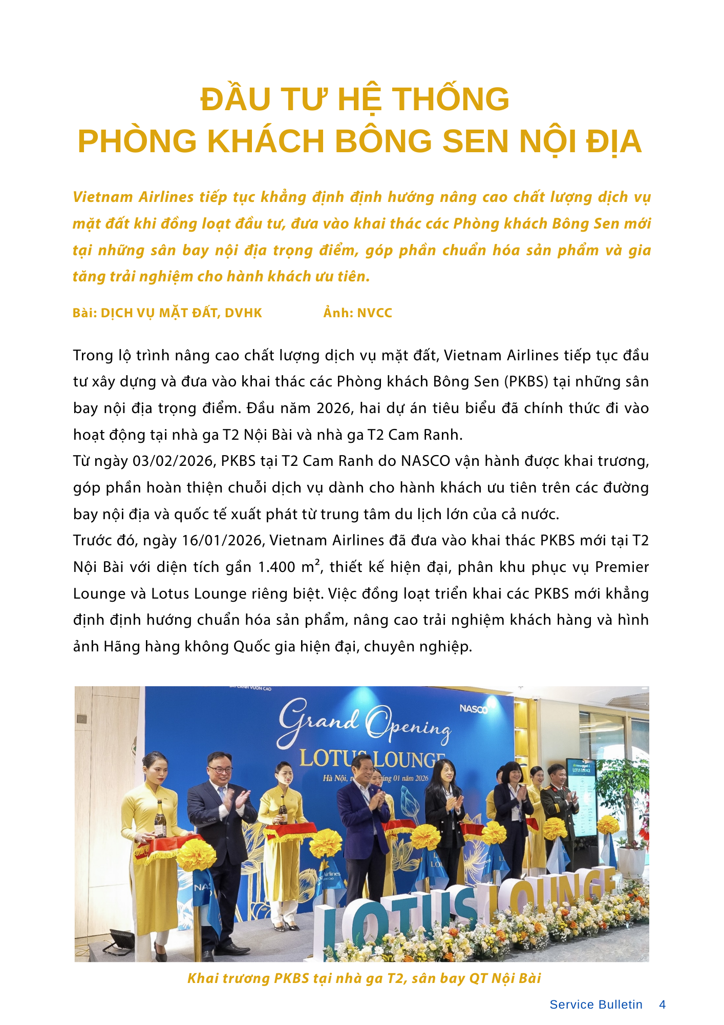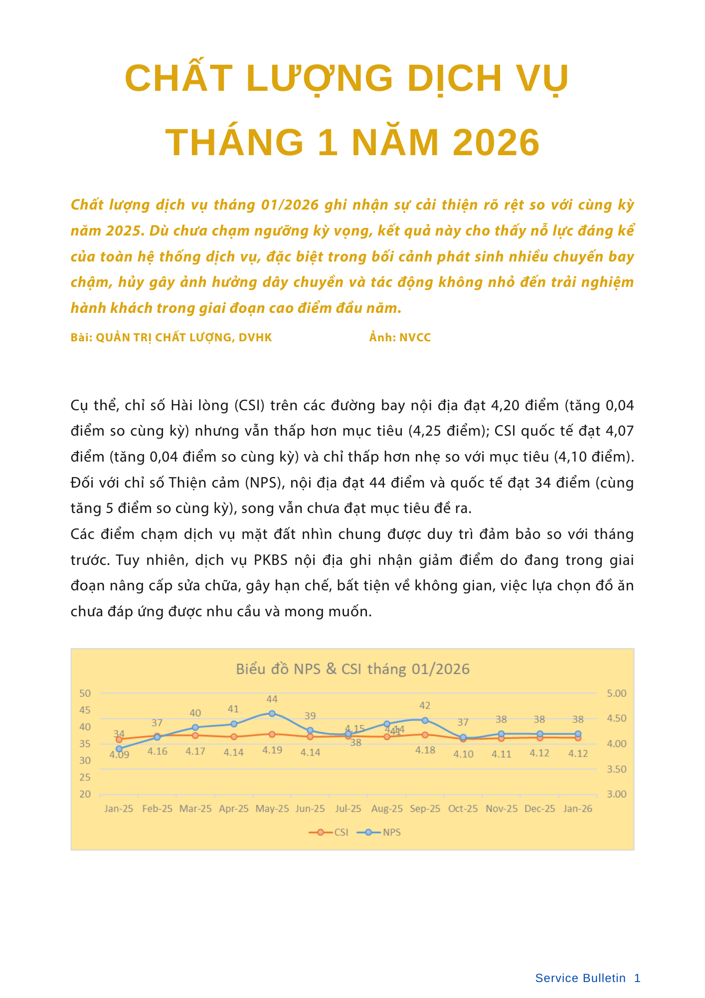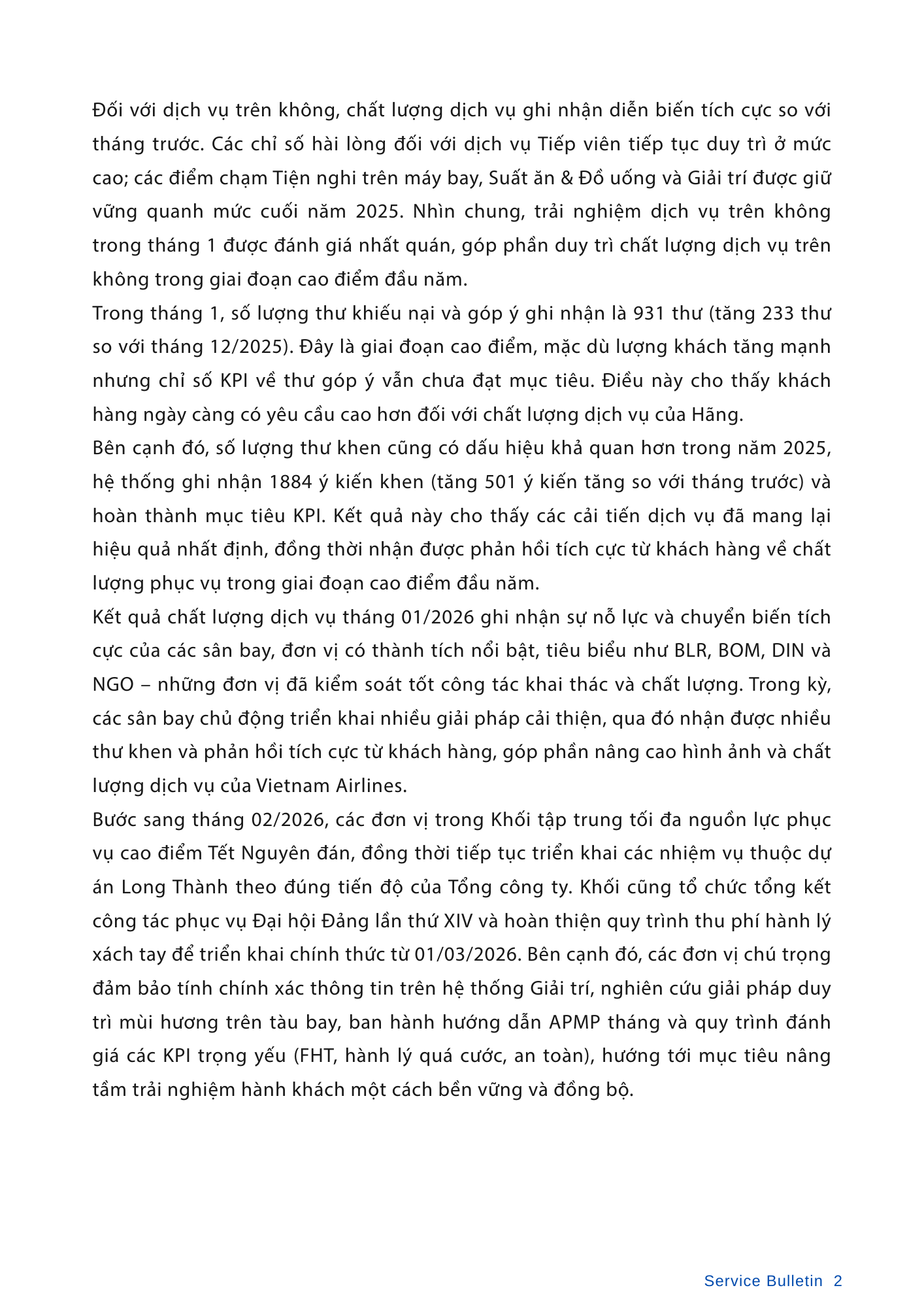 Chất lượng dịch vụ tháng 01/2026 ghi nhận sự cải thiện rõ rệt và chuyển biến tích cực so với cùng kỳ năm 2025, đặc biệt tại các đơn vị tiêu biểu như BLR, BOM, DIN và NGO. Dù đối mặt với áp lực khai thác cao điểm đầu năm, toàn hệ thống đã nỗ lực duy trì sự ổn định, đồng thời khẳng định vị thế quốc tế qua sự ghi nhận từ Quốc hội Hàn Quốc và những bước tiến mới trong đầu tư hạ tầng phòng khách, nâng cấp sản phẩm SkySofa.
