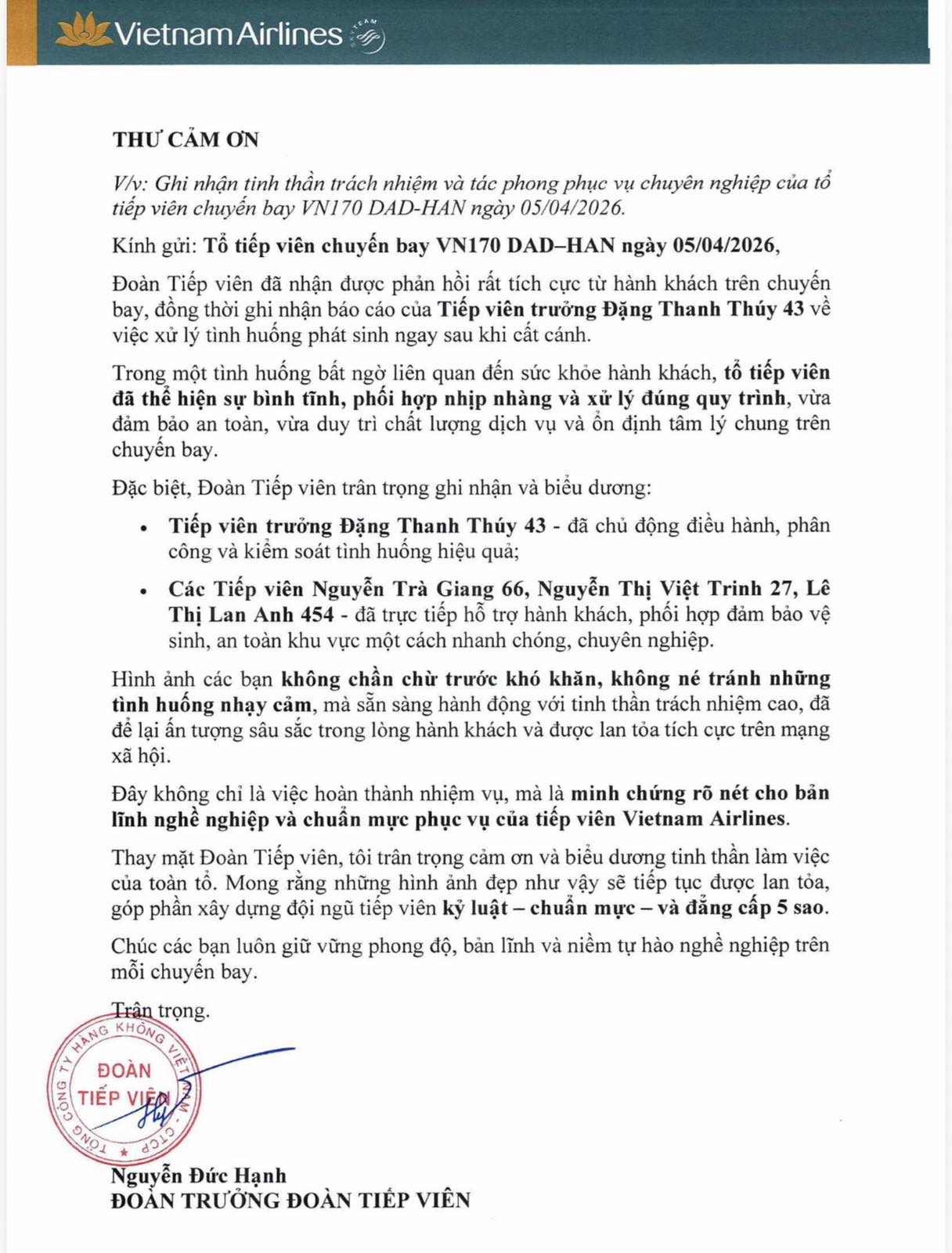 Ngay sau chuyến bay, Tiếp viên trưởng cũng đã có báo cáo ghi nhận đầy đủ về sự việc. Tình huống phát sinh bất ngờ ngay sau khi cất cánh, song tổ tiếp viên đã phối hợp nhịp nhàng, xử lý đúng quy trình, hỗ trợ hành khách kịp thời và đảm bảo khoang khách nhanh chóng trở lại trạng thái ổn định. Báo cáo đồng thời nhấn mạnh tinh thần trách nhiệm và tác phong chuyên nghiệp của đội ngũ trong suốt quá trình xử lý.