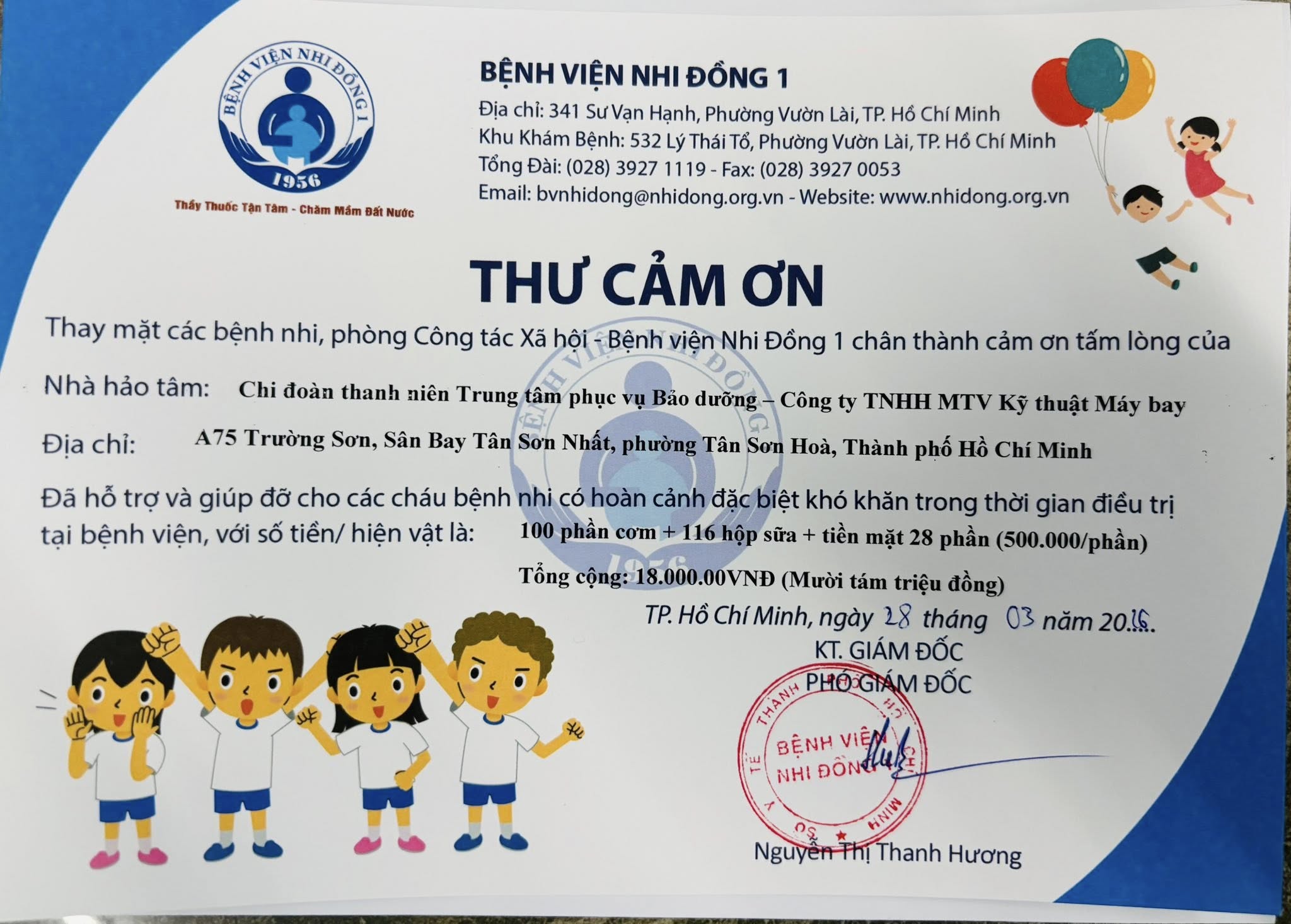Với mong muốn sẻ chia và tiếp thêm nghị lực cho các bệnh nhi đang điều trị tại bệnh viện, Chi đoàn Trung tâm Phục vụ Bảo dưỡng đã trực tiếp trao tặng 100 suất cơm kèm 116 hộp sữa TH đến các em nhỏ đang điều trị. Những phần quà tuy giản dị nhưng chứa đựng tình cảm chân thành, góp phần mang lại niềm vui và sự ấm áp cho các bệnh nhi và gia đình.