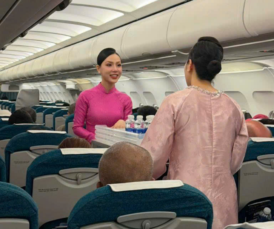Không gian cabin trở nên gần gũi và ấm áp hơn với hình ảnh những tà áo dài thướt tha và sự chăm sóc tận tình của đội ngũ tiếp viên.