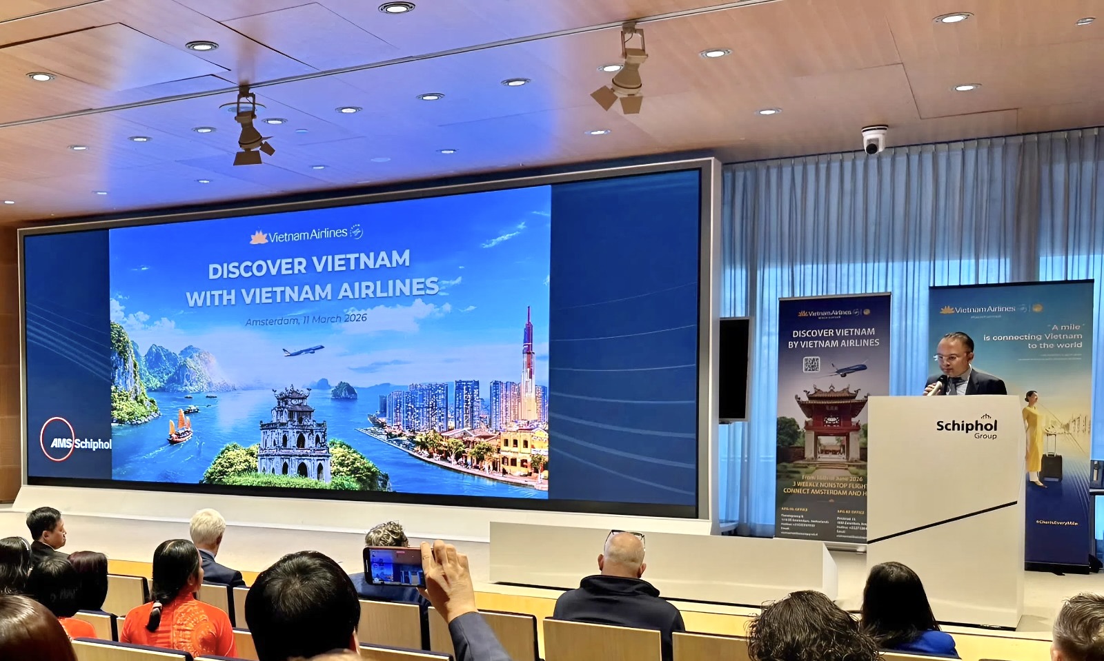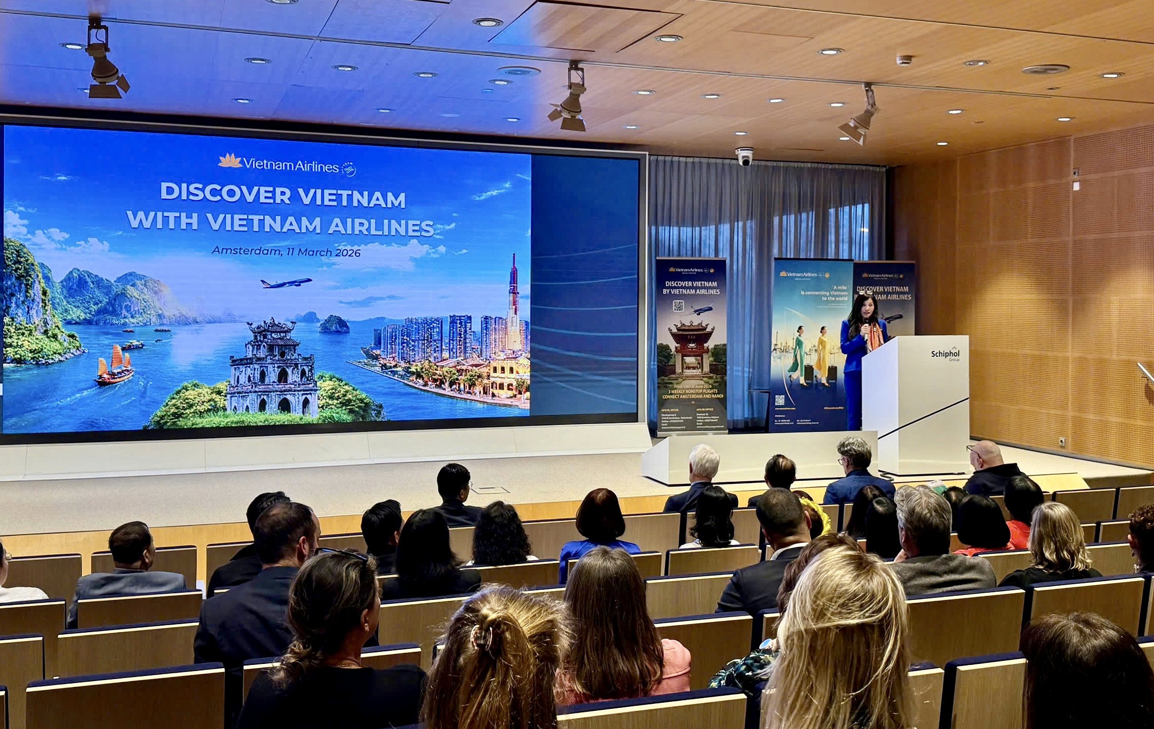 Ông Nguyễn Quang Trung, Phó Tổng Giám đốc Vietnam Airlines, cho biết: “Châu Âu luôn là một trong những thị trường quốc tế trọng điểm của Vietnam Airlines. Việc tổ chức chương trình phát động bán và công bố đường bay thẳng Hà Nội – Amsterdam tại Hà Lan thể hiện cam kết của chúng tôi trong việc tăng cường hợp tác với hệ thống đại lý và đối tác du lịch trên toàn khu vực. Chúng tôi tin rằng đường bay mới sẽ mở ra nhiều cơ hội kết nối thuận tiện giữa châu Âu và Việt Nam, góp phần thúc đẩy du lịch, thương mại và giao lưu nhân dân giữa hai khu vực.”