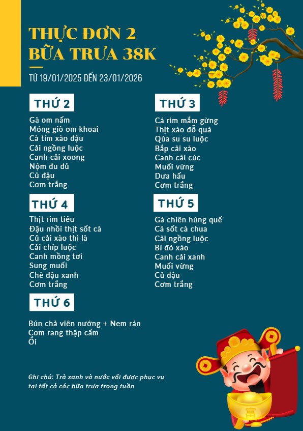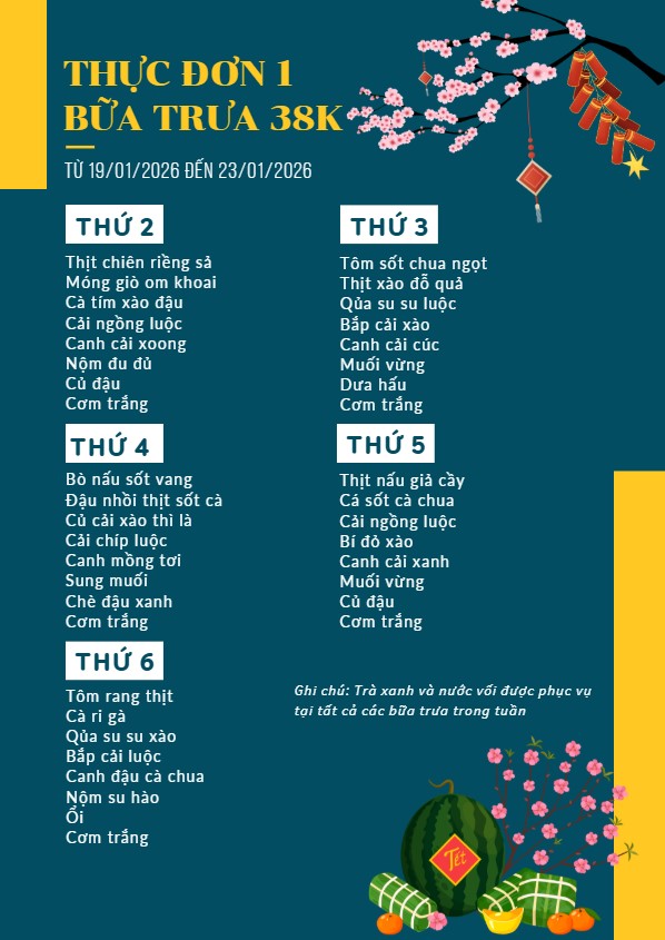 Đến hẹn lại lên, thực đơn tuần này với nhiều món quen thuộc, dễ ăn và cân bằng dinh dưỡng, phù hợp cho những ngày làm việc cần sự tập trung và ổn định. Các món mặn luân phiên giữa thịt, cá, tôm cùng rau xanh, canh thanh mát giúp bữa trưa nhẹ nhàng mà vẫn đủ năng lượng cho buổi chiều làm việc thật năng suất. Bữa trưa tại tầng 2 Sky Lounge được phục vụ với giá 38.000 đồng/suất.