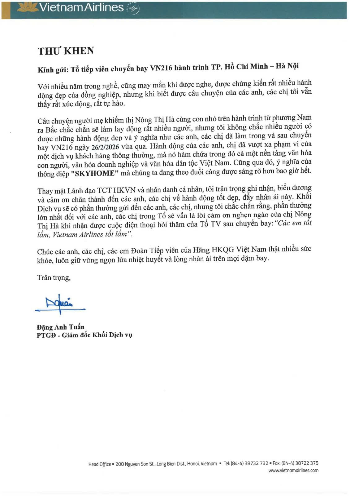 Hành trình đầy nhân văn của tổ tiếp viên VN216 đã được PTGĐ Đặng Anh Tuấn ghi nhận qua bức thư khen ngợi sự phối hợp nhuần nhuyễn và thái độ phục vụ tận hiến. Đó là minh chứng rõ nét cho bản lĩnh của những người sứ giả bầu trời, khi họ không chỉ làm đúng quy trình mà còn làm bằng cả trái tim. Bức thư khen không chỉ ghi nhận bản lĩnh xử lý tình huống, mà còn tôn vinh những trái tim luôn biết thấu cảm và phục vụ bằng cả sự chân thành, làm rạng rỡ thêm bản sắc văn hóa dân tộc Việt Nam.