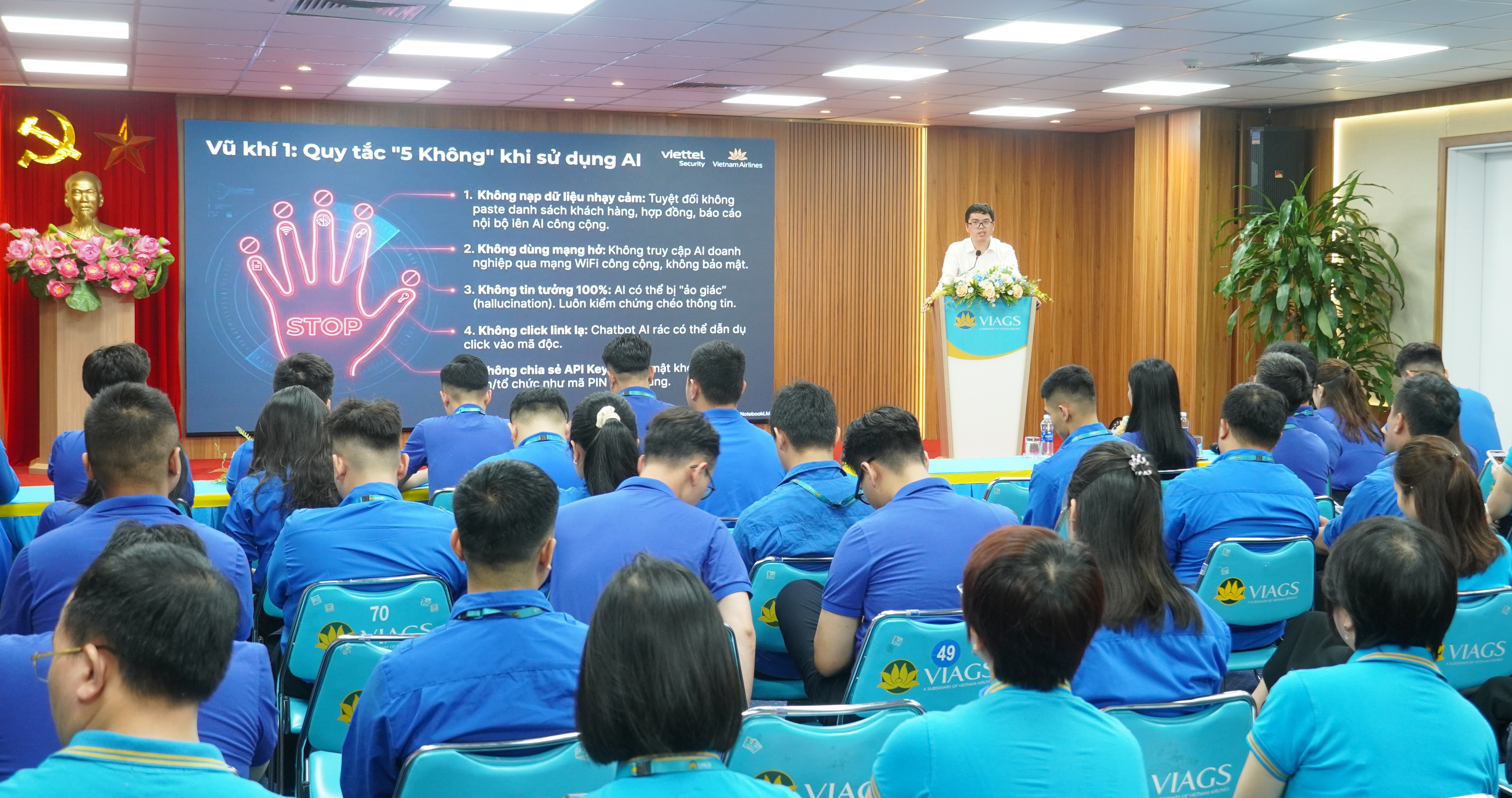 Song song đó, Đoàn Thanh niên VIAGS phối hợp cùng Phòng Công nghệ thông tin tổ chức lớp tập huấn “An ninh thông tin và bảo mật dữ liệu trong kỷ nguyên AI và ứng dụng số” với sự tham gia của 200 đoàn viên thanh niên đến từ ba miền. Chương trình đã trang bị kiến thức quan trọng, giúp đoàn viên nâng cao ý thức và kỹ năng bảo vệ dữ liệu, thích ứng với yêu cầu ngày càng cao của môi trường làm việc hiện đại.