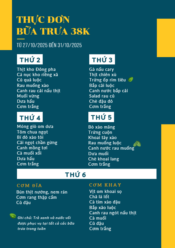 Khi giờ trưa đã điểm, Sky Lounge lại tỏa hương hấp dẫn với hàng loạt món đưa cơm như: thịt kho Đông Pha, cá nục kho riềng thơm nức, vịt om khoai sọ, bò xào măng, tôm chua ngọt, móng giò om dưa, gà nấu cà ri,… Đừng quên thứ 6 bếp có bún thịt nướng và nem rán – combo quốc dân ăn hoài chẳng ngán, thêm cơm rang thập cẩm cho ai thích bữa trưa nhanh gọn.