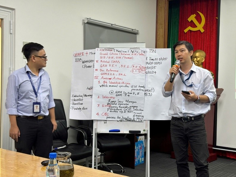 Không dừng lại ở lý thuyết, khóa học còn tạo điều kiện để các học viên tham gia thực hành mô phỏng đánh giá RBI. Các bài tập tập trung vào các khía cạnh tiềm ẩn rui ro trong khai thác của Pacific Airlines Qua đó, giúp các nhóm học viên hình dung cụ thể hơn về cách vận hành phương pháp mới trong môi trường làm việc thực tế.