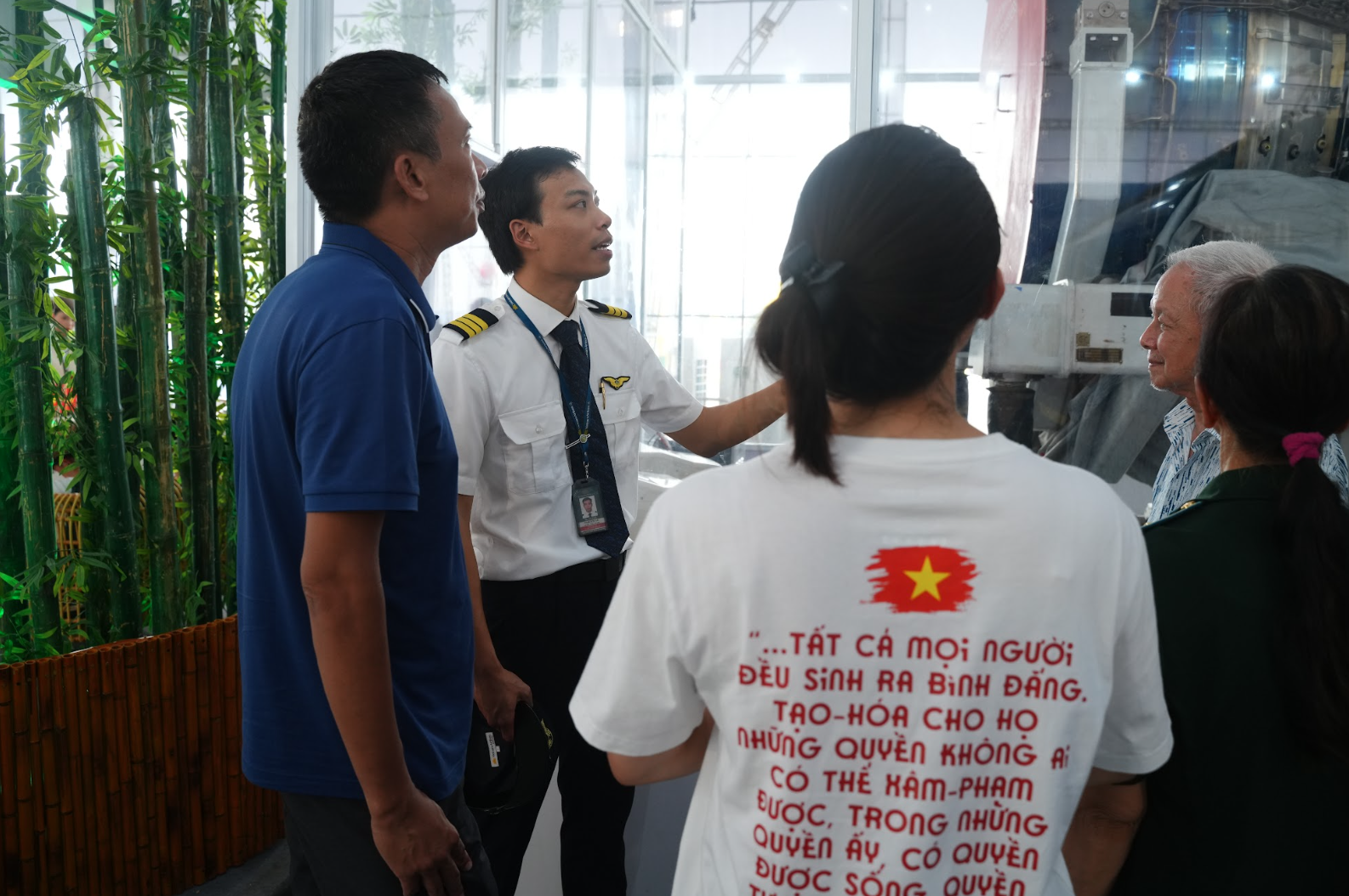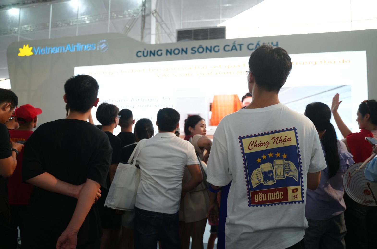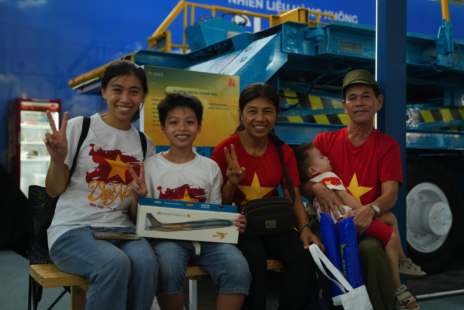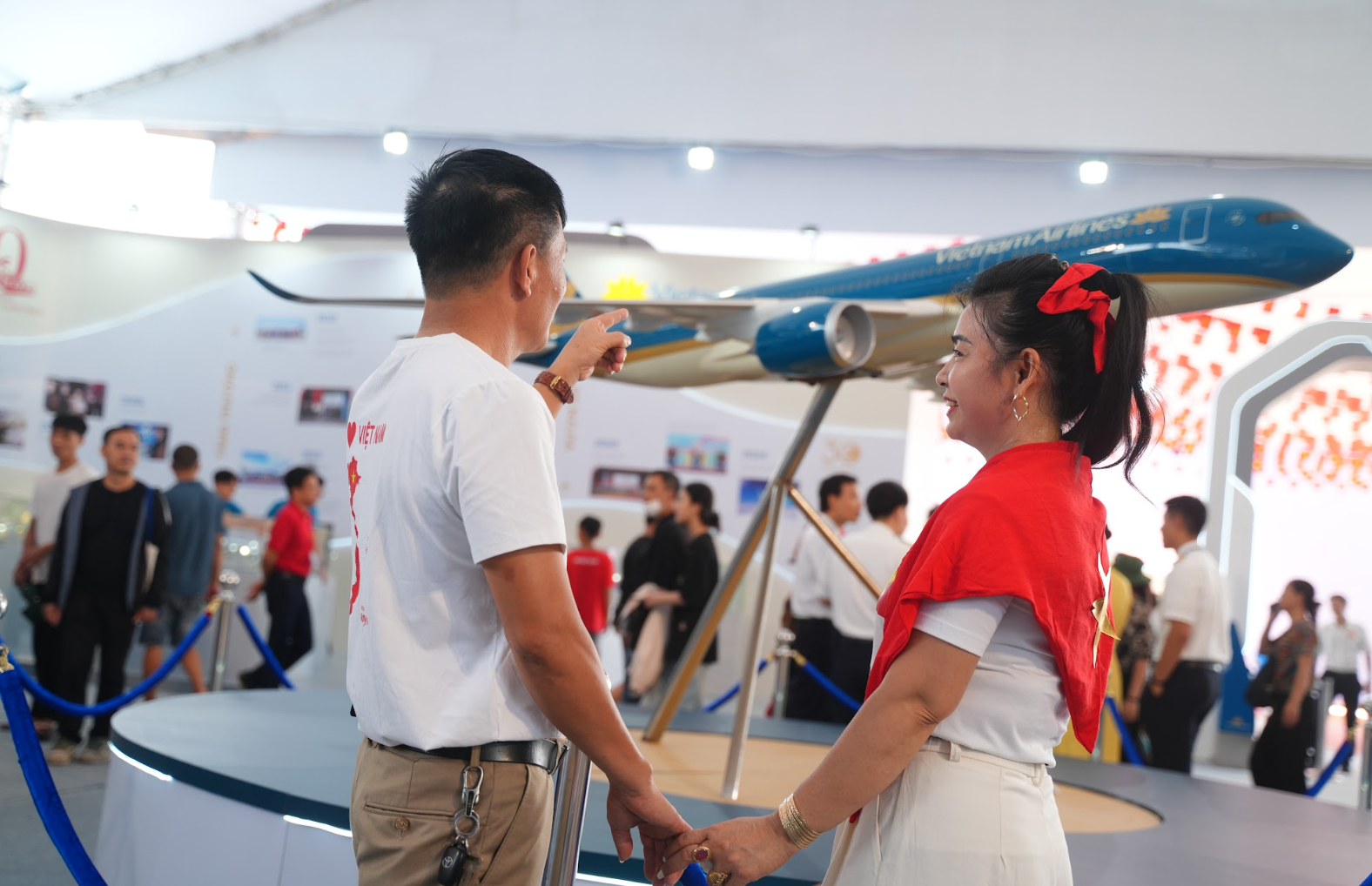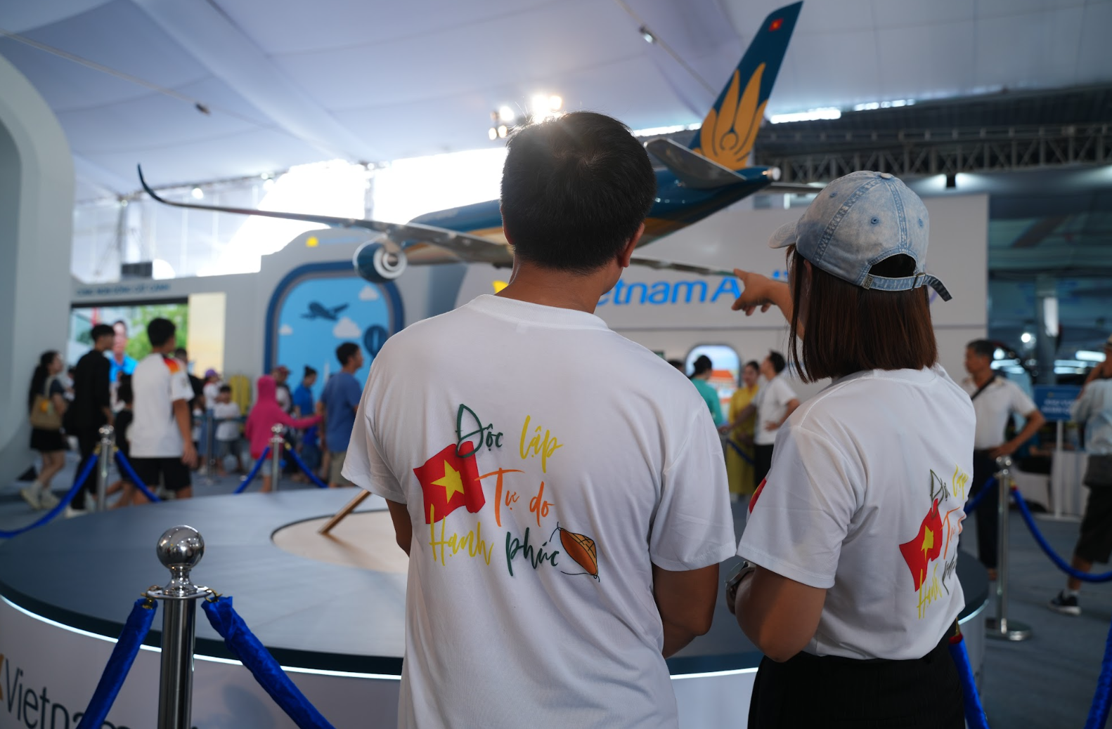 Không gian triển lãm của Vietnam Airlines nhanh chóng trở thành “sân khấu” của sắc đỏ sao vàng. Từ những bạn trẻ năng động đến các gia đình nhiều thế hệ, ai cũng hào hứng diện áo cờ, cùng nhau chụp ảnh, cười nói rộn ràng. Mỗi nụ cười, mỗi bộ trang phục không chỉ đơn thuần là kỷ niệm đẹp mà còn như một cách công chúng gửi đi lời nhắn: hòa bình, đoàn kết và khát vọng bay cao luôn hiện hữu trong trái tim người Việt.