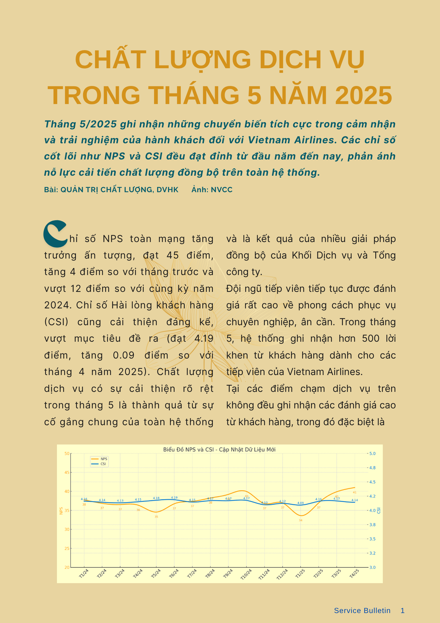 Tháng 5/2025 ghi nhận những chuyển biến tích cực trong cảm nhận và trải nghiệm của hành khách đối với Vietnam Airlines. Các chỉ số cốt lõi như NPS và CSI đều đạt đỉnh từ đầu năm đến nay, phản ánh nỗ lực cải tiến chất lượng đồng bộ trên toàn hệ thống.