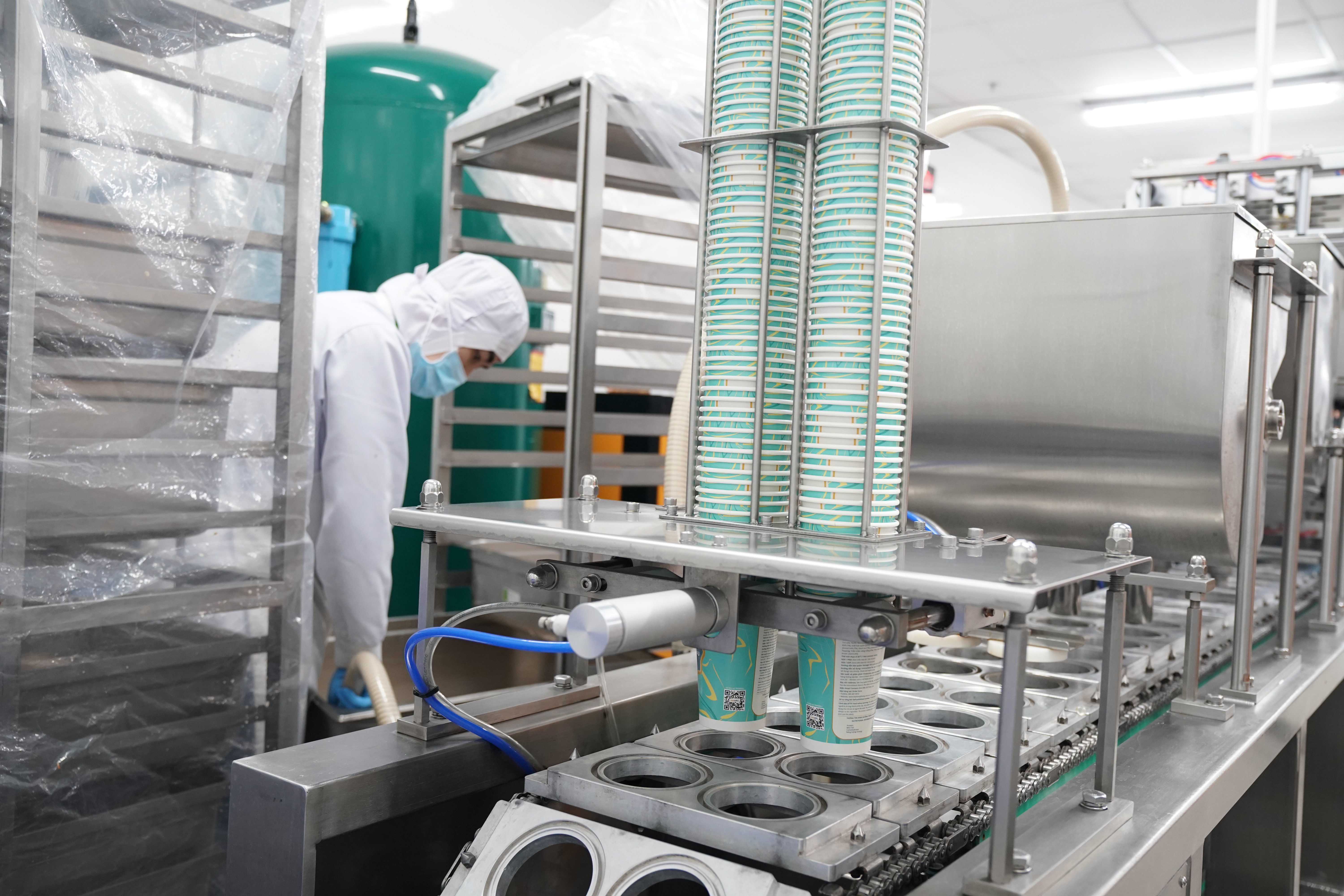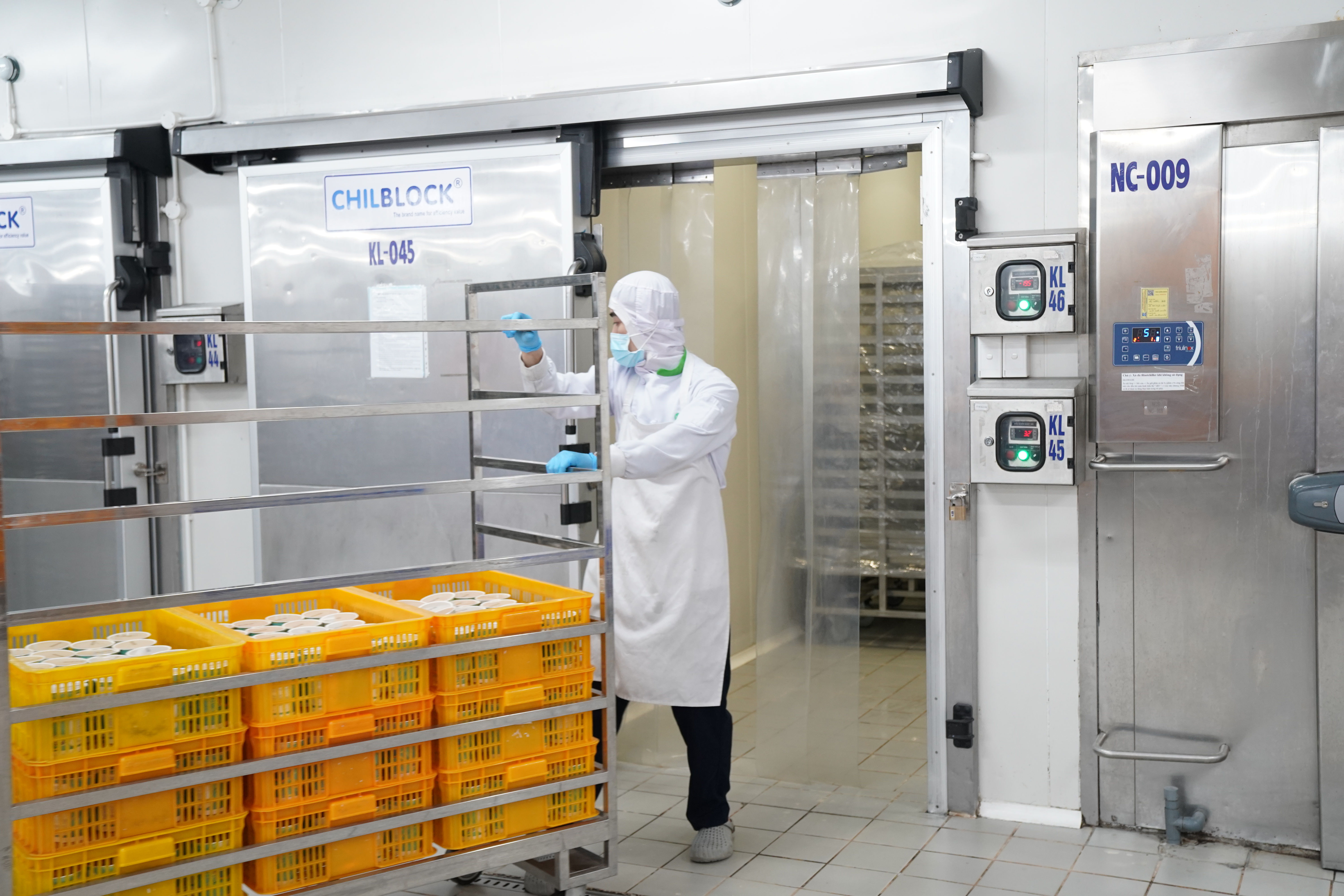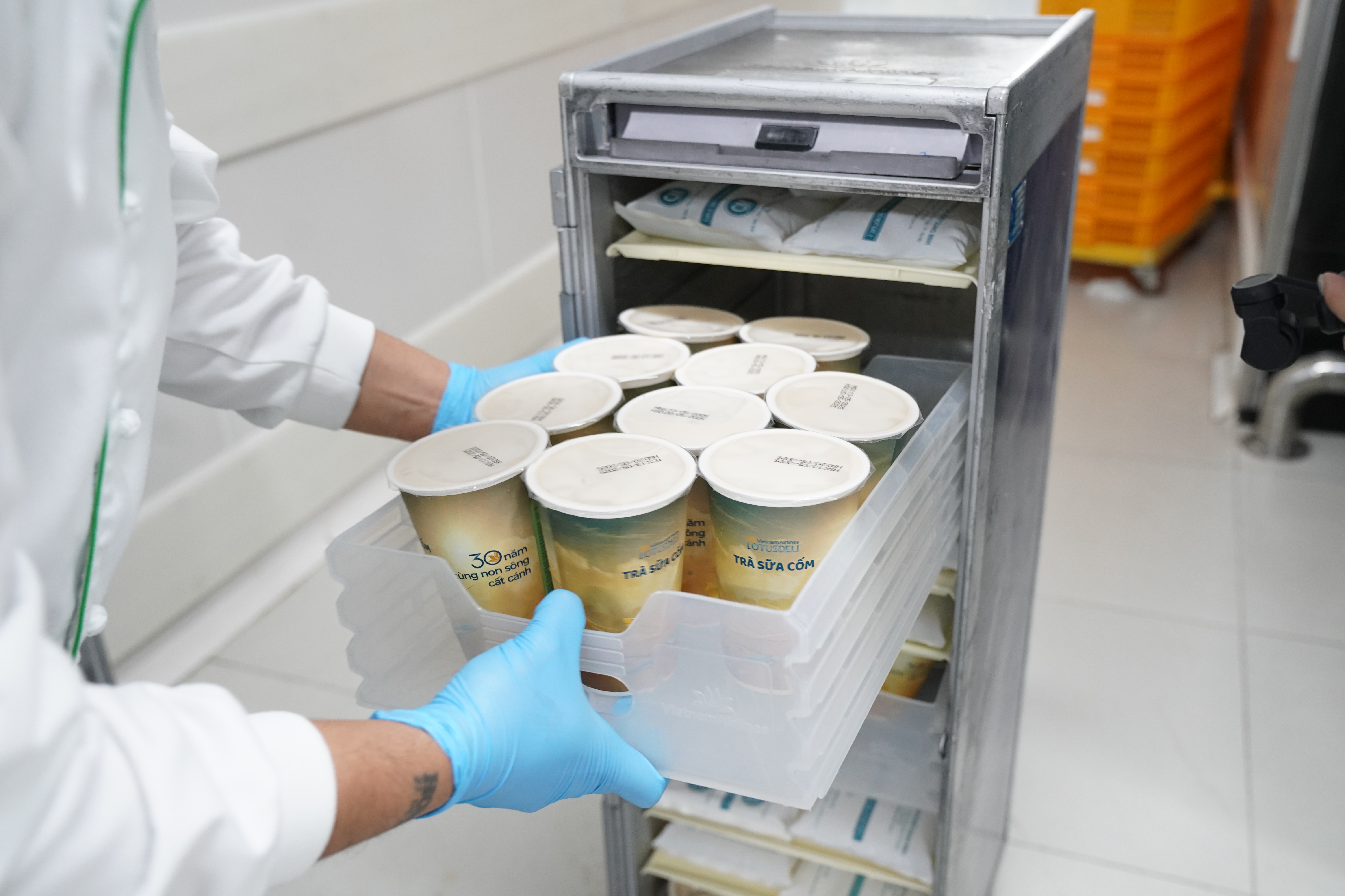 Trà sữa cốm sau khi nấu xong được làm lạnh nhanh xuống dưới 10 độ C, tiếp tục được bảo quản trong kho lạnh duy trì nhiệt độ từ 0 – 5 độ C. Quá trình đóng gói tuân thủ thời gian tiêu chuẩn, hạn chế tối đa tiếp xúc với môi trường bên ngoài. Tất cả nhằm giữ trọn hương vị truyền thống, đảm bảo độ tươi mát, an toàn và ổn định trong điều kiện đặc biệt trên máy bay.