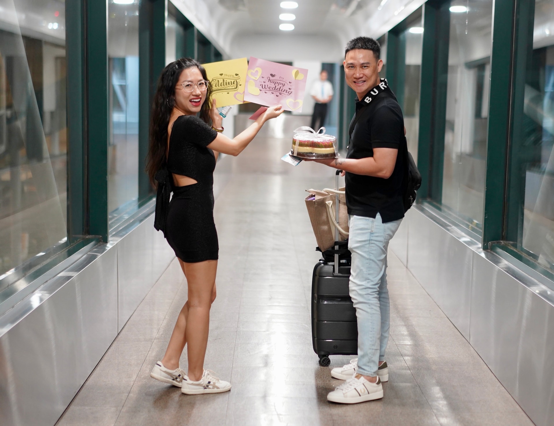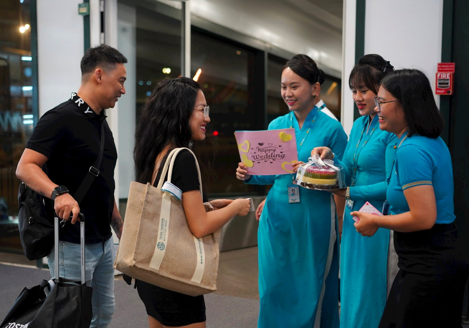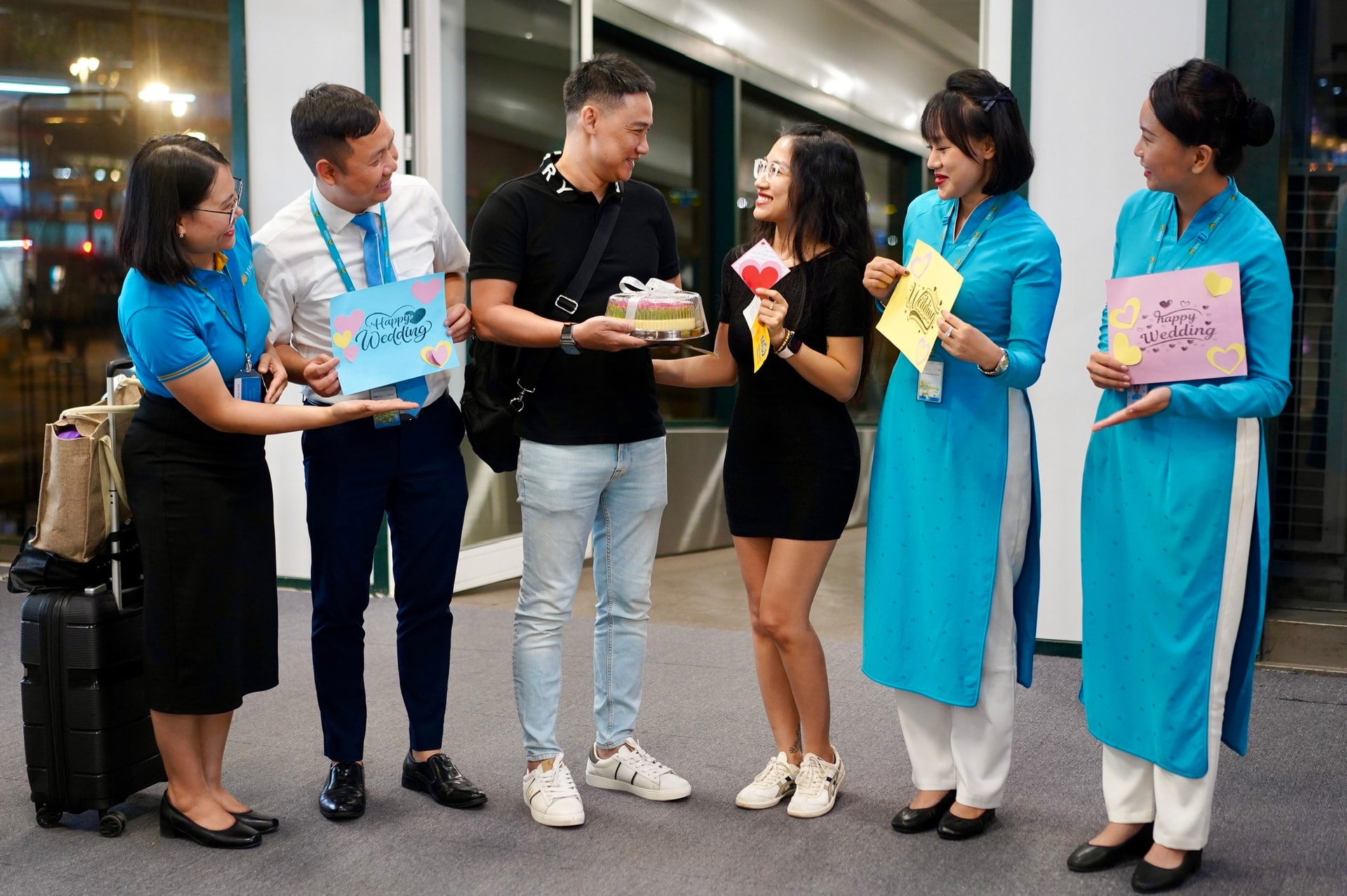 Chỉ ít phút sau, đôi bạn và nhóm bạn bè được mời vào làm thủ tục tại quầy ưu tiên để thuận tiện cho việc chụp ảnh và mang theo nhiều phụ kiện cưới.