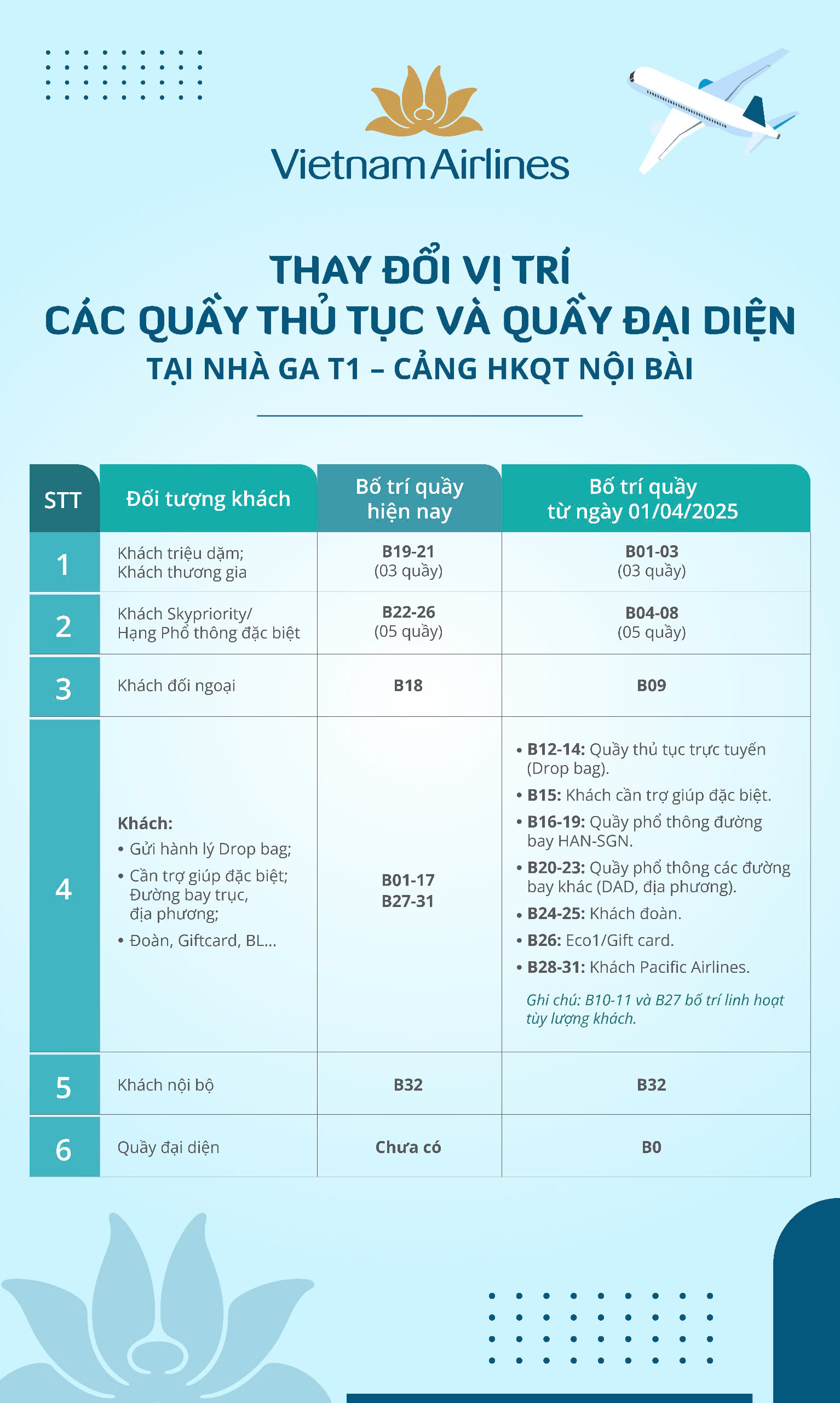 Theo đó, nhằm nâng cao chất lượng dịch vụ và mang đến sự thuận tiện tối đa cho hành khách, hệ thống quầy làm thủ tục được sắp xếp lại theo từng nhóm hành khách, với Quầy B0 là quầy đại diện hỗ trợ của Vietnam Airlines.