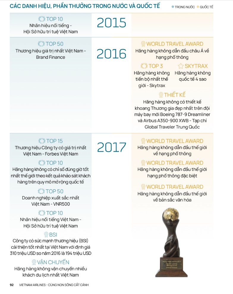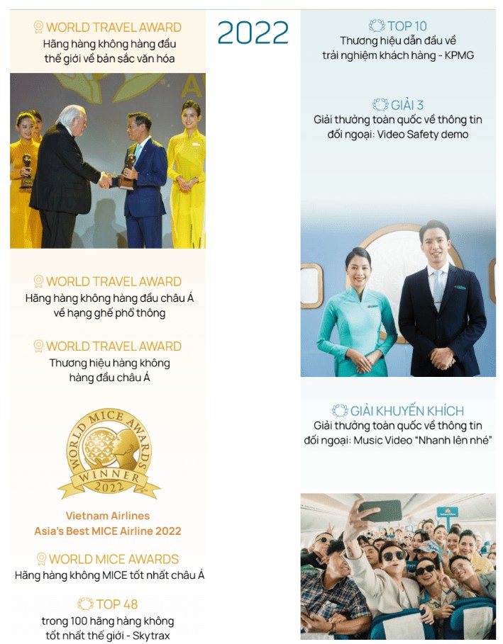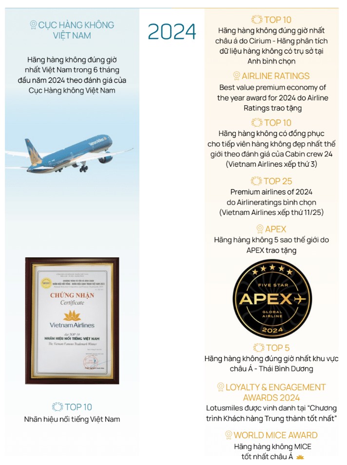 Trong lịch sử phát triển của mình, Tổng công ty Hàng không Việt Nam đã được Nhà nước tặng thưởng Huân chương Hồ Chí Minh, Huân chương Độc lập, Huân chương Lao động… và nhiều hình thức khen thưởng khác. Những thành tựu này không chỉ phản ánh bước tiến vững chắc của Vietnam Airlines trên con đường phát triển bền vững mà còn mở ra cánh cửa ra thế giới, mang đến cho hành khách những trải nghiệm bay đẳng cấp và dịch vụ hoàn hảo.