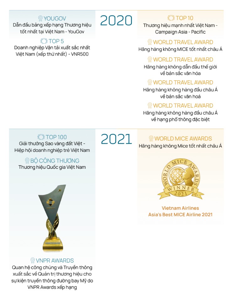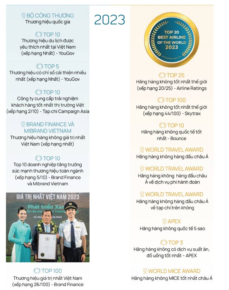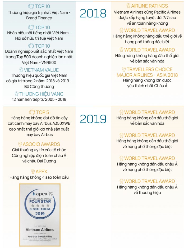 Dưới đây là tổng hợp những danh hiệu cao quý mà Vietnam Airlines đã chinh phục được trong suốt 30 năm qua. Các danh hiệu cao quý vừa là phần thưởng cho các nỗ lực không ngừng của Vietnam Airlines, vừa là những dấu mốc đánh giá bước tiến vững chắc hướng đến vị thế một hãng hàng không 5 sao, phát triển bền vững, có quy mô toàn cầu.