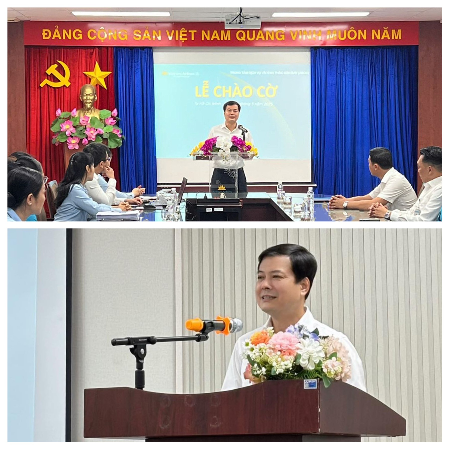 Đồng chí Bùi Đức Thanh – Bí thư Đảng ủy, Giám đốc Trung tâm Dịch vụ và Khai thác Sân bay (ASOC) đã trực tiếp tham dự và chủ trì lễ chào cờ tại ba sân bay căn cứ. Tại buổi lễ, đồng chí Bùi Đức Thanh đánh giá cao, ghi nhận và cảm ơn sự nỗ lực vượt bậc, cố gắng, đoàn kết hết mình của toàn thể đội ngũ cán bộ, chuyên viên của Trung tâm đã quyết tâm thực hiện nhiệm vụ quan trọng lãnh đạo TCT giao – hoàn thành xuất sắc công tác phục vụ cao điểm Đại lễ 30/4 – 1/5, kỷ niệm 50 năm ngày giải phóng miền Nam, thống nhất đất nước (30/4/1975 – 30/4/2025).
