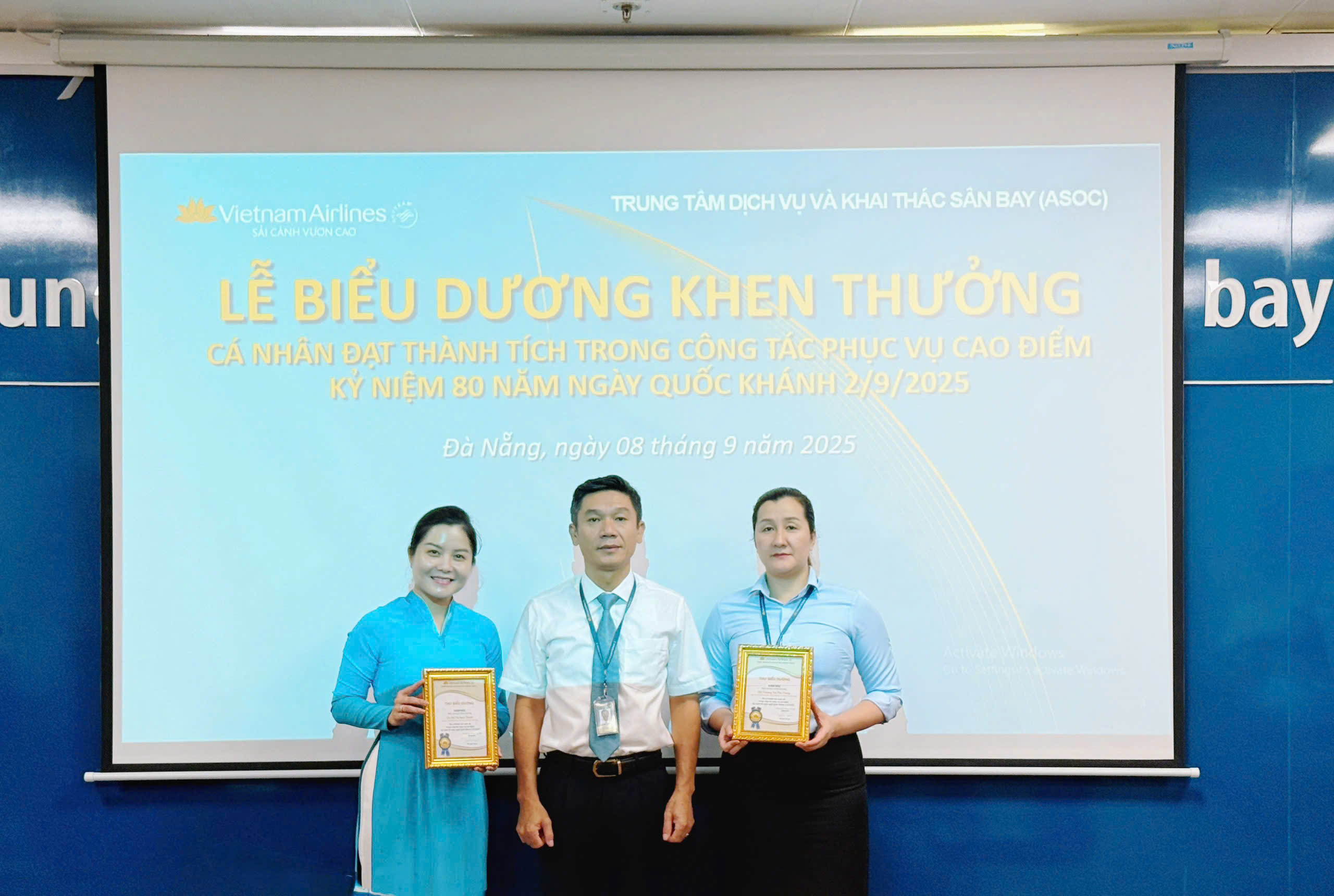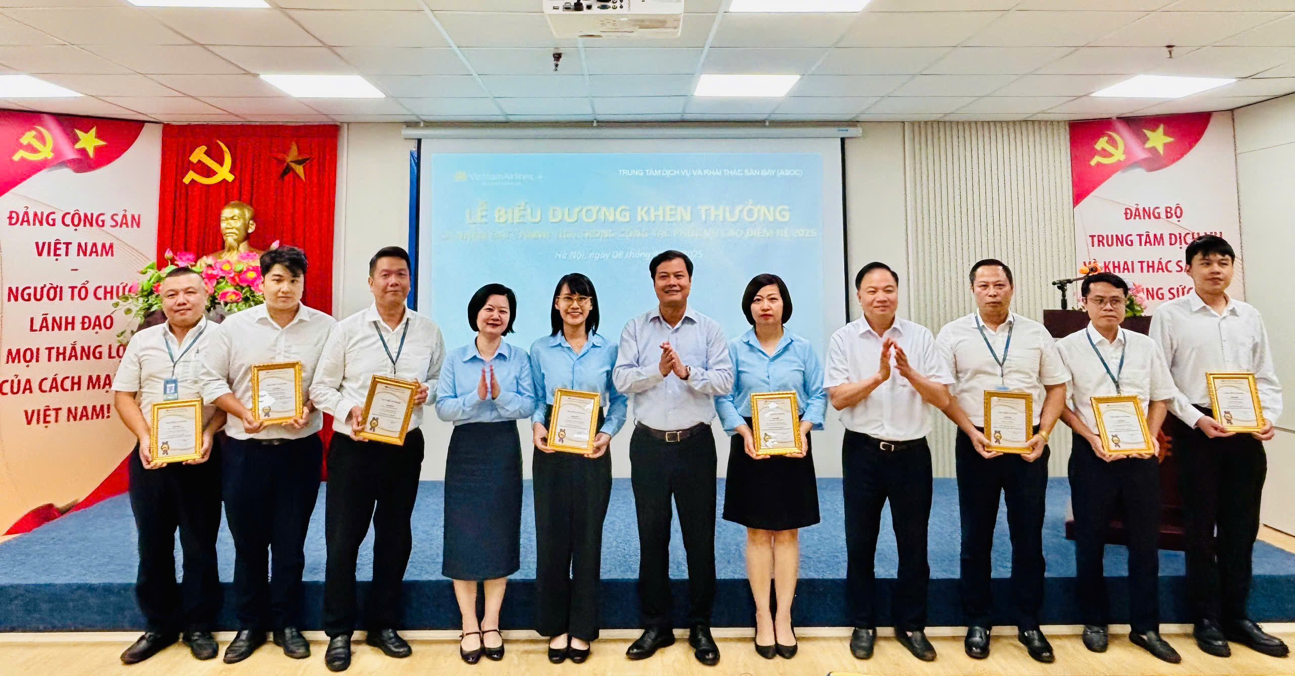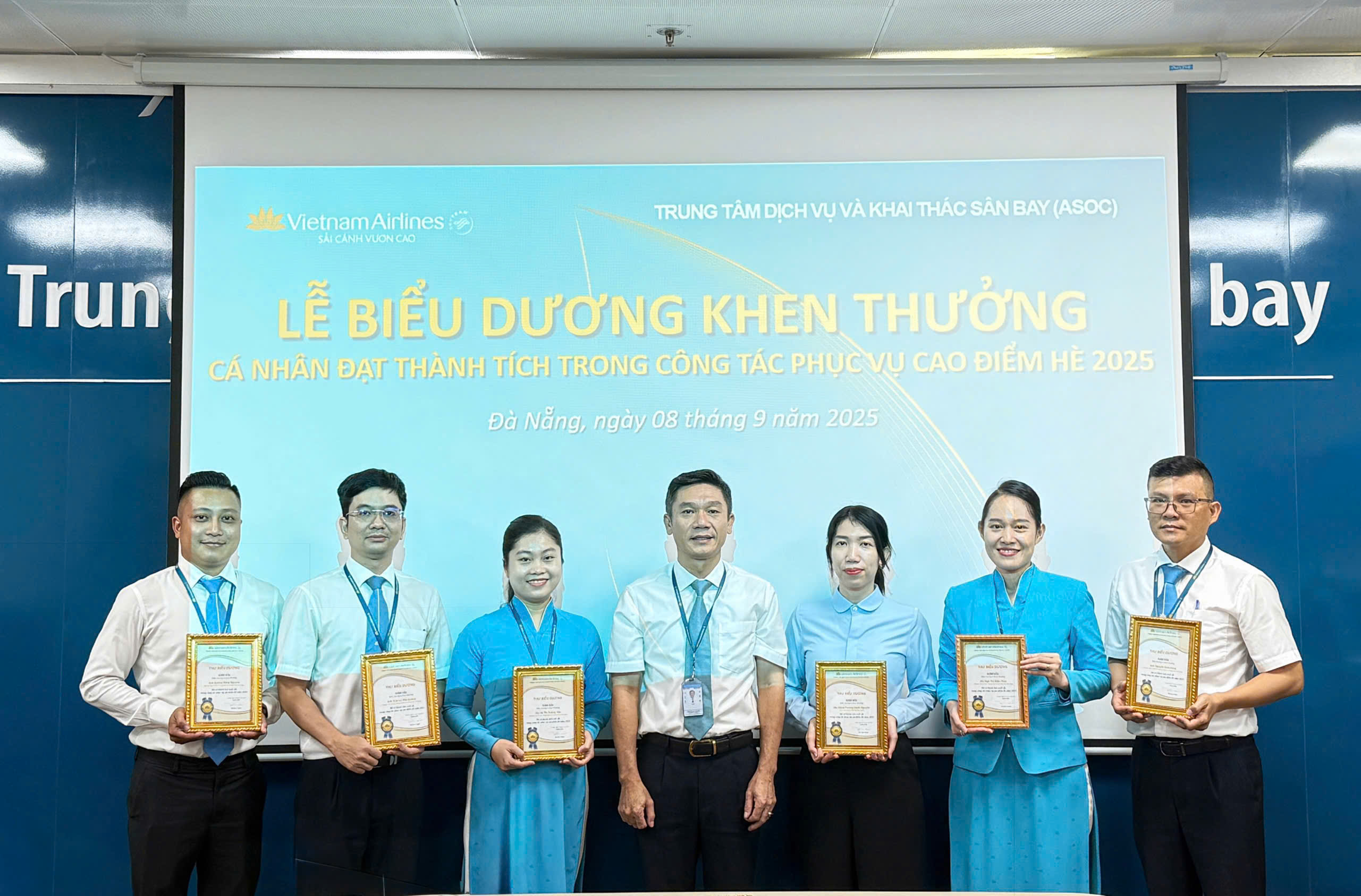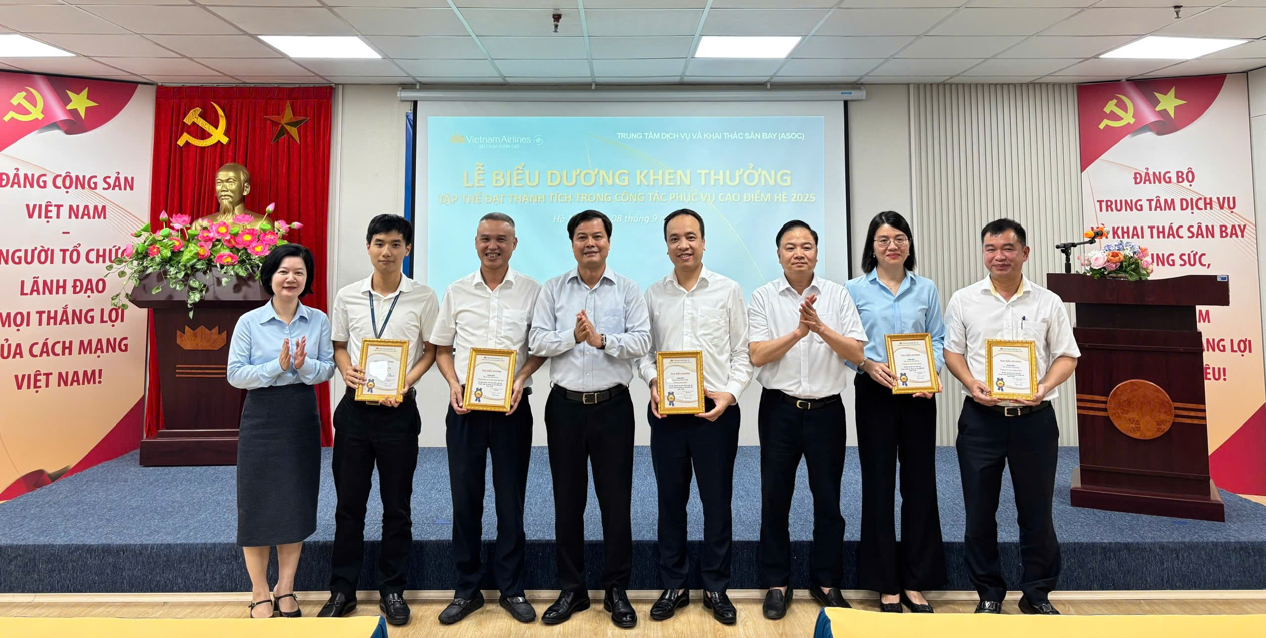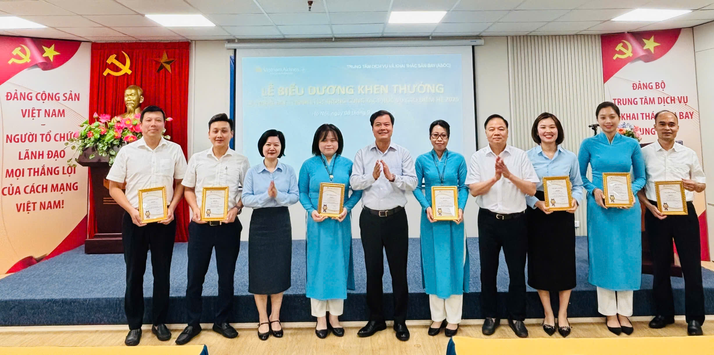 Các cá nhân đạt thành tích trong công tác phục vụ cao điểm Kỷ niệm 80 năm ngày Quốc khánh 2/9/2025 tại khu vực Nội Bài và cá nhân đạt thành tích trong công tác phục vụ cao điểm Hè 2025 đã được vinh danh tại buổi lễ – những gương mặt tiêu biểu cho sự tận tụy, trách nhiệm và tinh thần phục vụ chuyên nghiệp, luôn nỗ lực hết mình vì mục tiêu nâng cao chất lượng dịch vụ, mang đến trải nghiệm tốt nhất cho hành khách và góp phần khẳng định uy tín của ASOC và Tổng công ty.