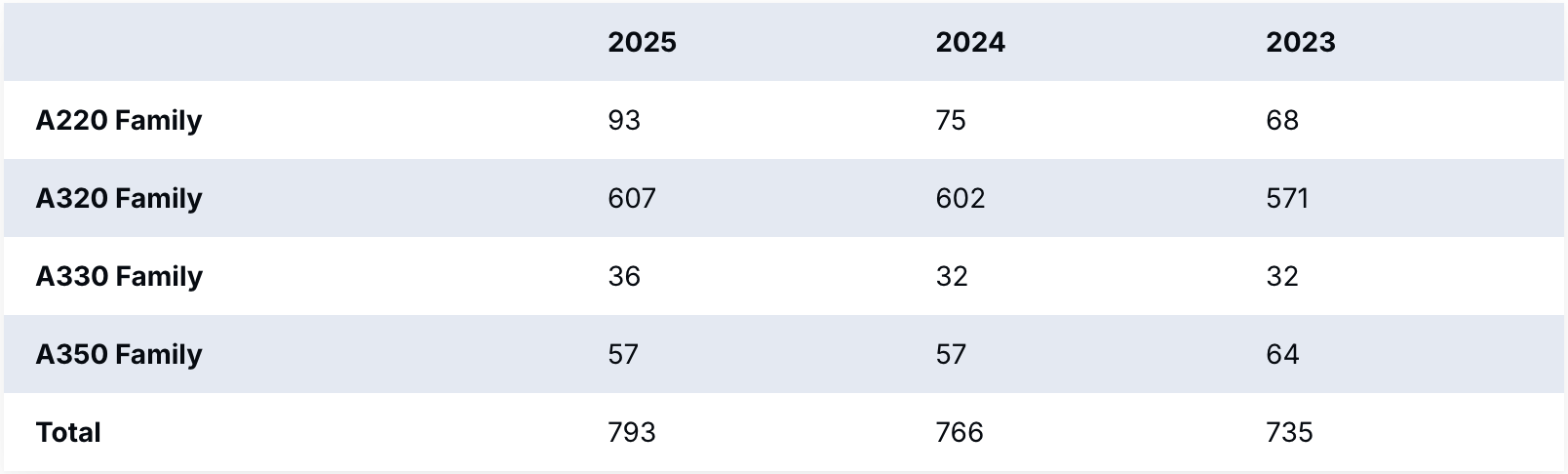 Trong cơ cấu bàn giao cả năm, máy bay một lối đi tiếp tục chiếm tỷ trọng áp đảo với 700 chiếc, bao gồm 93 chiếc A220 và 607 máy bay thuộc dòng A320neo. Ở phân khúc thân rộng, Airbus bàn giao 34 chiếc A330neo (trong đó có 1 chiếc A330-800), 2 chiếc A330-200 để chuyển đổi sang phiên bản A330 MRTT, cùng 57 chiếc A350 (bao gồm 15 chiếc A350-1000). Tổng số máy bay bàn giao tăng 3,5% so với năm 2024, bất chấp những khó khăn kéo dài trong chuỗi cung ứng.