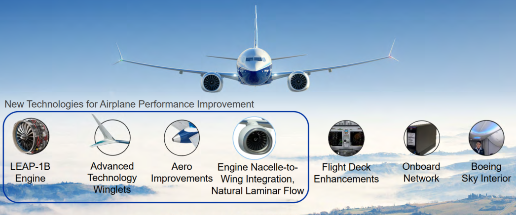 Các phiên bản đều được trang bị động cơ CFM LEAP-1B hiện đại, kết hợp với thiết kế khí động học tối ưu, cánh winglet công nghệ cao, và các vật liệu hợp kim nhôm mới, giúp giảm trọng lượng và tiêu thụ nhiên liệu. Theo Boeing, 737 MAX đạt mức tiết kiệm nhiên liệu tới 21% so với dòng 737NG trước đó.