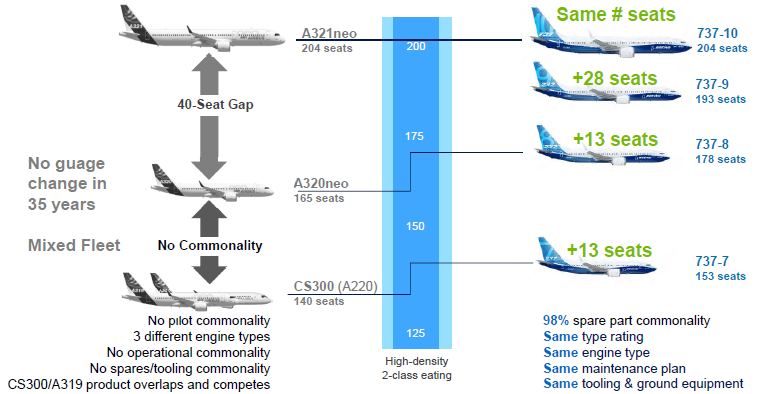 - Tính đồng bộ: các phiên bản 737 MAX chia sẻ tới 98% linh kiện giống nhau, giúp các hãng khai thác tiết kiệm chi phí phụ tùng vật tư và đào tạo phi hành đoàn. Tương tự, Airbus cũng áp dụng chiến lược đồng bộ linh kiện trên các dòng A320neo để tối ưu chi phí khai thác.