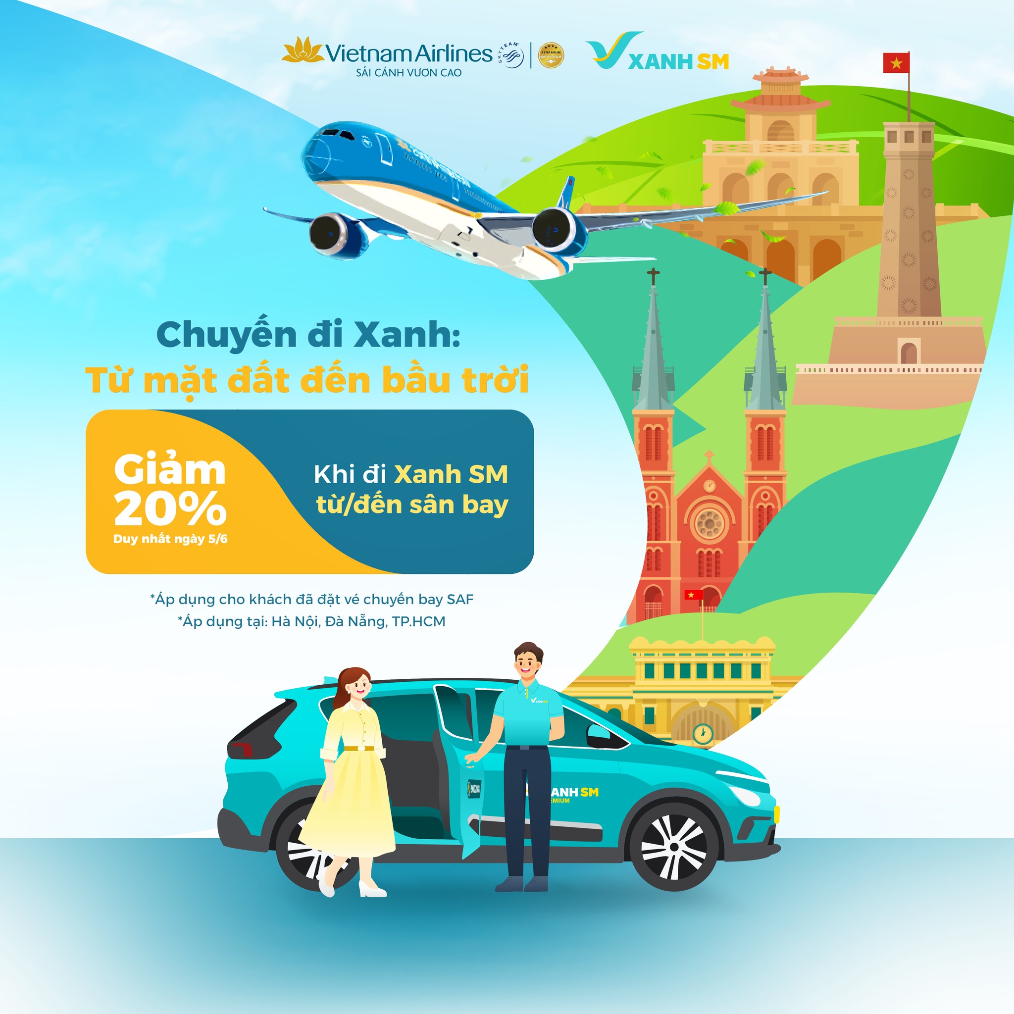 Theo đó, duy nhất ngày 5/6, hành khách trên 6 chuyến bay đặc biệt do Vietnam Airlines khai thác, sử dụng nhiên liệu SAF – loại nhiên liệu giúp giảm tới 80% khí thải nhà kính trong vòng đời sử dụng, sẽ nhận được ưu đãi đặc biệt từ Xanh SM, với mức giảm 20%, tối đa 50K cho chuyến xe điện Xanh SM. Mã sẽ được gửi trực tiếp đến email/SMS của hành khách đã đặt vé chuyến bay SAF.