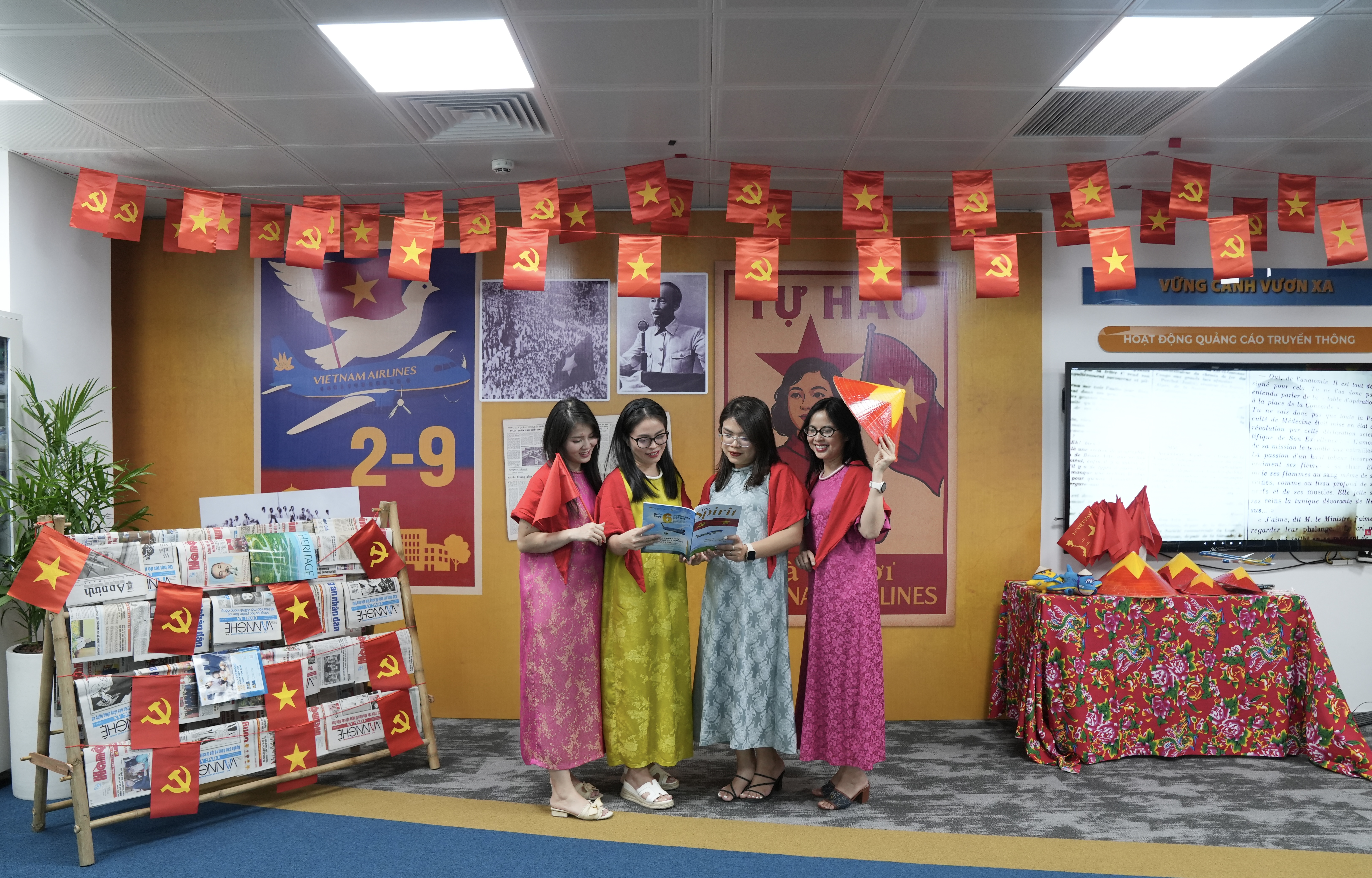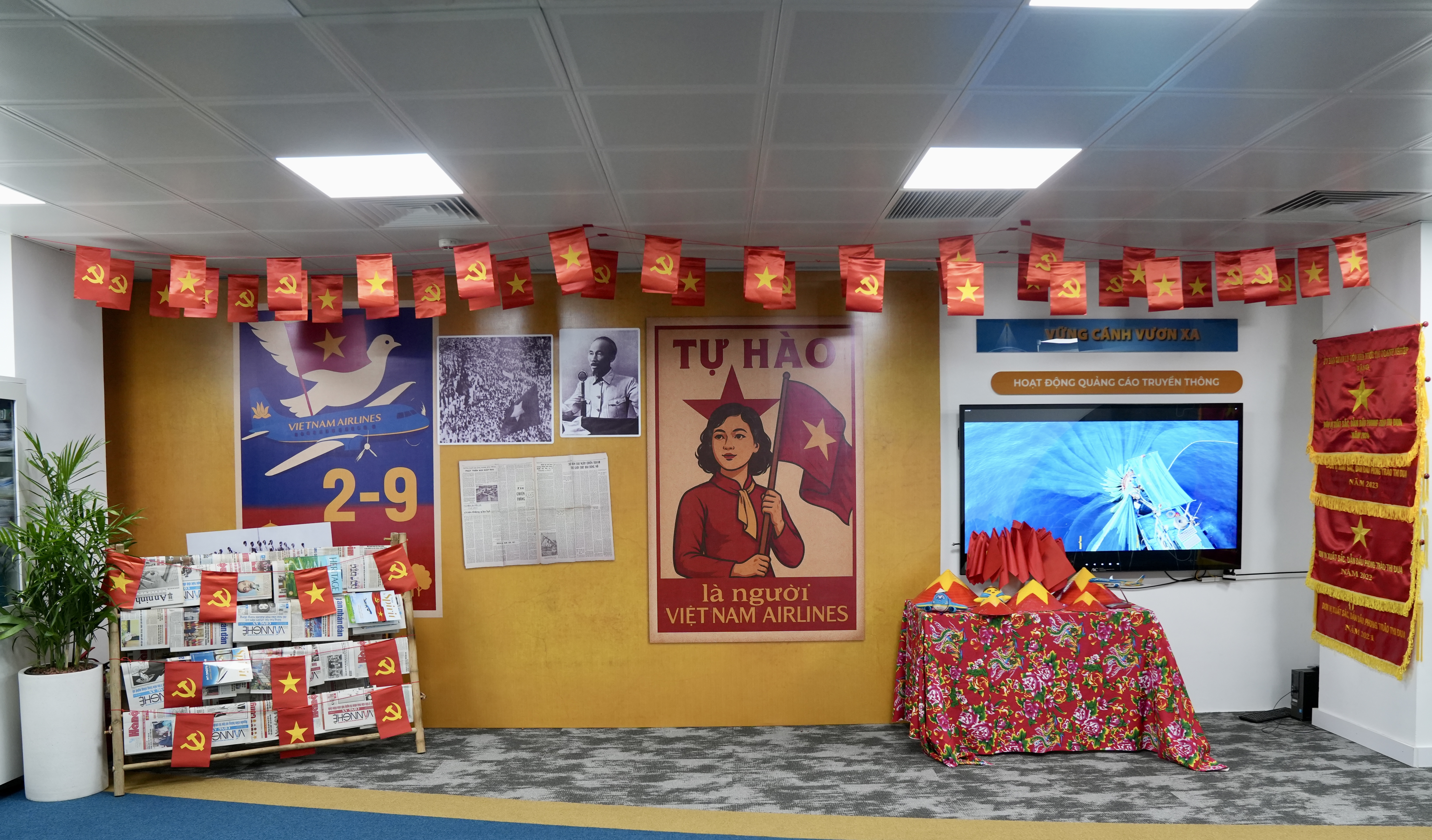 Điểm nhấn nổi bật của không gian là bức poster cổ động với hình ảnh nữ cán bộ cầm lá cờ đỏ sao vàng cùng dòng chữ “Tự hào là người Vietnam Airlines”. Kệ báo cổ điển trang trí cờ Đảng và cờ Tổ quốc, màn LED trình chiếu phim tư liệu cùng những mascot đáng yêu của Hãng đã góp phần tạo nên một không khí trang trọng, gần gũi và giàu tính gợi nhớ.