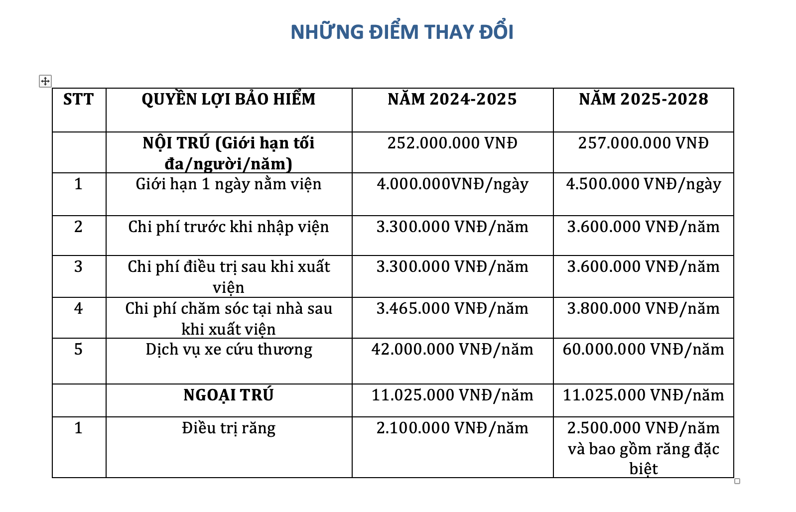 Chương trình bảo hiểm sức khỏe này sẽ có hiệu lực từ ngày 6/8/2025 đến 5/8/2028, với sự đồng hành của Tổng Công ty Bảo hiểm Bảo Việt. Ngoài những nội dung được chia sẻ tại hội nghị, mọi thắc mắc sẽ tiếp tục được giải đáp qua hotline 24/7 hoặc thông qua các đầu mối bảo hiểm của từng hợp đồng cụ thể. Sau hội nghị, tài liệu tổng hợp các câu hỏi thường gặp cũng sẽ được gửi qua email để đảm bảo tất cả cán bộ, nhân viên đều có thể tiếp cận thông tin.