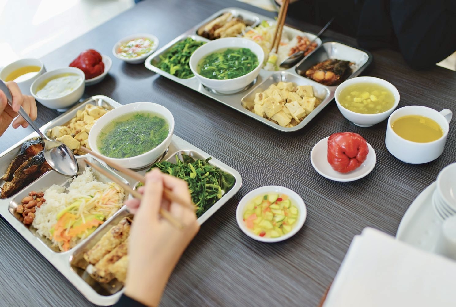 Đến bữa trưa, thực đơn tuần đầu 2026 vẫn mang đến hai lựa chọn phong phú, thay đổi linh hoạt từng ngày. Các món mặn quen thuộc như thịt kho củ cải, cá chiên mắm, tôm rang thịt, bò om dưa chua được kết hợp cùng các món rau luộc, canh thanh mát và món tráng miệng nhẹ nhàng sẽ góp phần giúp anh chị em tiếp thêm năng lượng để hoàn thành các công việc buổi chiều.