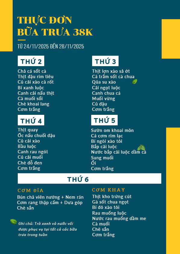 Đến trưa, chỉ với 38.000 đồng là có ngay những phần ăn chuẩn cơm nhà và đủ dinh dưỡng. Cơm trắng nóng hổi ăn kèm chả cá sốt cà, thịt đậu rim tiêu, sườn om khoai môn hay thịt kho trứng cút ngon miễn bàn. Thứ 6, ngoài cơm khay, anh chị em có có thêm lựa chọn khác như bún chả viên nướng, nem rán hoặc cơm rang thập cẩm. Bên cạnh món chính, bếp Sky Lounge còn có những món ăn kèm giúp giải ngán như cà muối sổi, sung muối, củ cải muối. Đừng quên, bữa trưa luôn được phục vụ kèm trà xanh, nước vối và các loại quả tráng miệng.