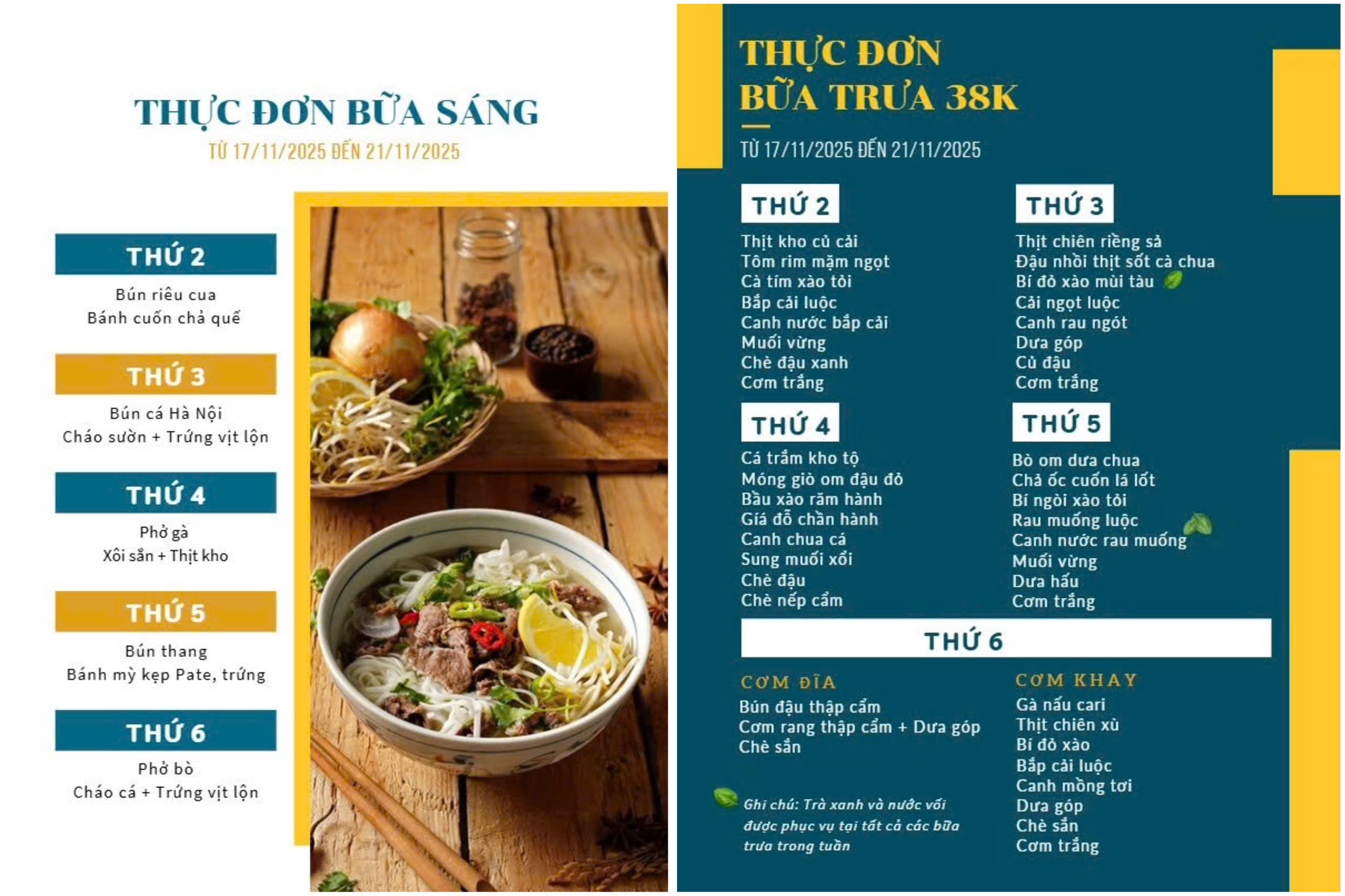Giữa trời lạnh, đừng quên món tráng miệng chốt sổ cho bữa trưa. Tuần này bếp có chè sắn nóng, chè đậu xanh, chè khoai lang, chè nếp cẩm cùng các loại hoa quả, trà xanh, nước vối.