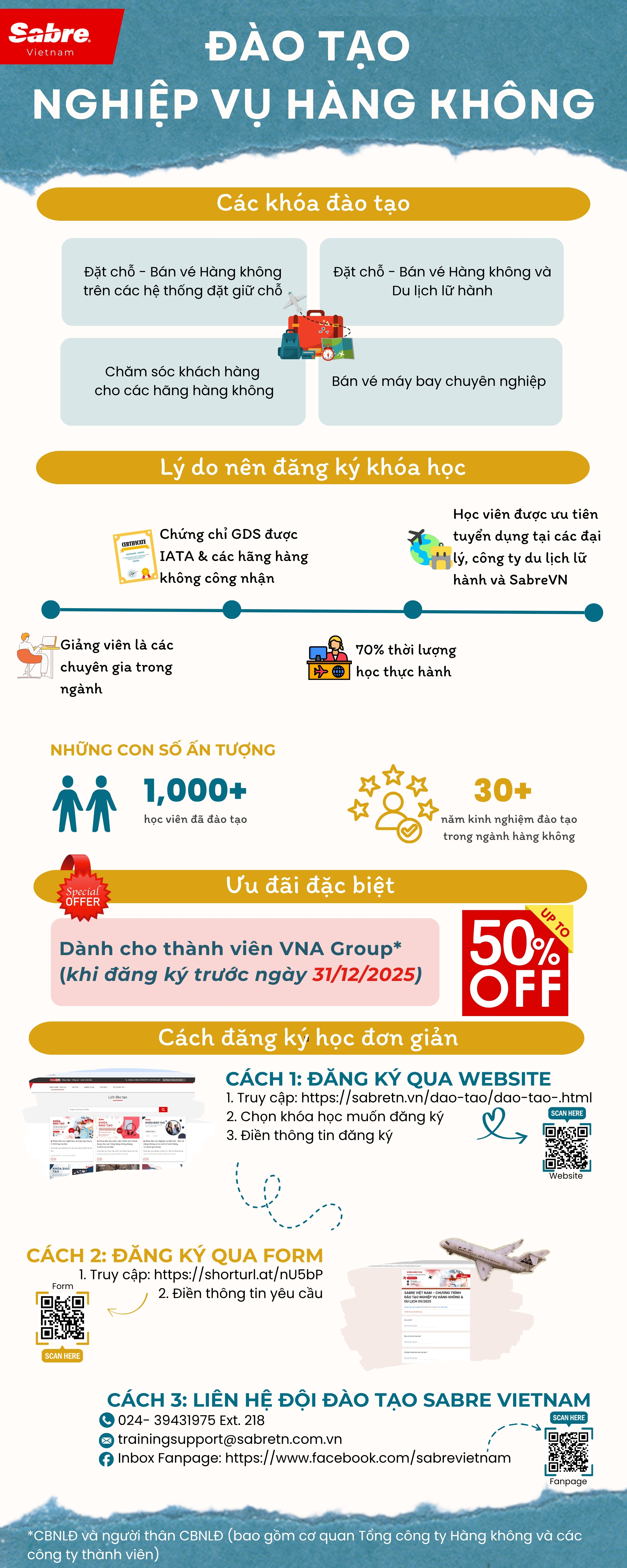 Trong bối cảnh ngành Hàng không – Du lịch liên tục phát triển, nhu cầu nhân lực chất lượng cao ngày càng trở thành ưu tiên hàng đầu của doanh nghiệp. Với hơn 30 năm kinh nghiệm, Sabre Vietnam đã khẳng định vị thế là một trong những đơn vị đào tạo uy tín, mang đến cho học viên môi trường học tập chuyên nghiệp, chương trình học gắn liền thực tiễn, cơ sở vật chất hiện đại và cơ hội nghề nghiệp rõ ràng. Sabre Vietnam hiện đang mở đăng ký các lớp học nghiệp vụ hàng không, mang đến lựa chọn học tập linh hoạt và thiết thực cho mọi đối tượng, thông tin chi tiết tại: https://sabretn.vn/dao-tao/dao-tao-.html |
