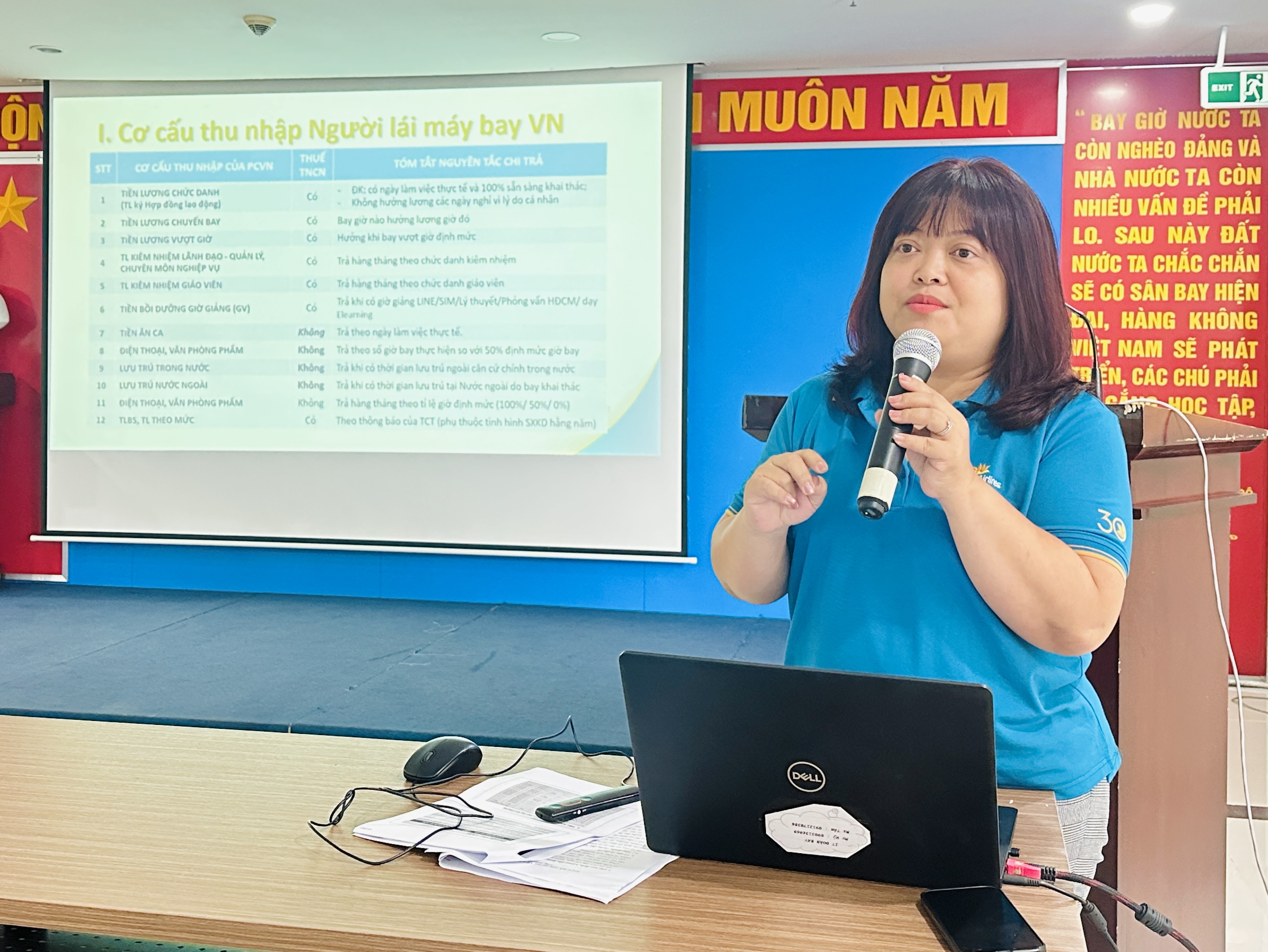 Nhằm giúp người lao động, đặc biệt là đội ngũ phi công, hiểu rõ hơn về chủ trương, nội dung và cách thức triển khai chính sách mới, bà Lê Phạm Tú Anh – Trưởng phòng Tổ chức Hành chính Đoàn bay, được ủy nhiệm của Lãnh đạo Đoàn bay – đã trực tiếp trình bày cụ thể về các điểm điều chỉnh trong chính sách tiền lương. Trong phần trình bày, bà Lê Phạm Tú Anh đã nêu rõ cách tính thu nhập theo từng chức danh với các ví dụ thực tế, giúp người lao động dễ dàng tiếp cận, so sánh và nắm bắt các thay đổi về mức lương và thu nhập theo quy định mới từ tháng 7/2025.