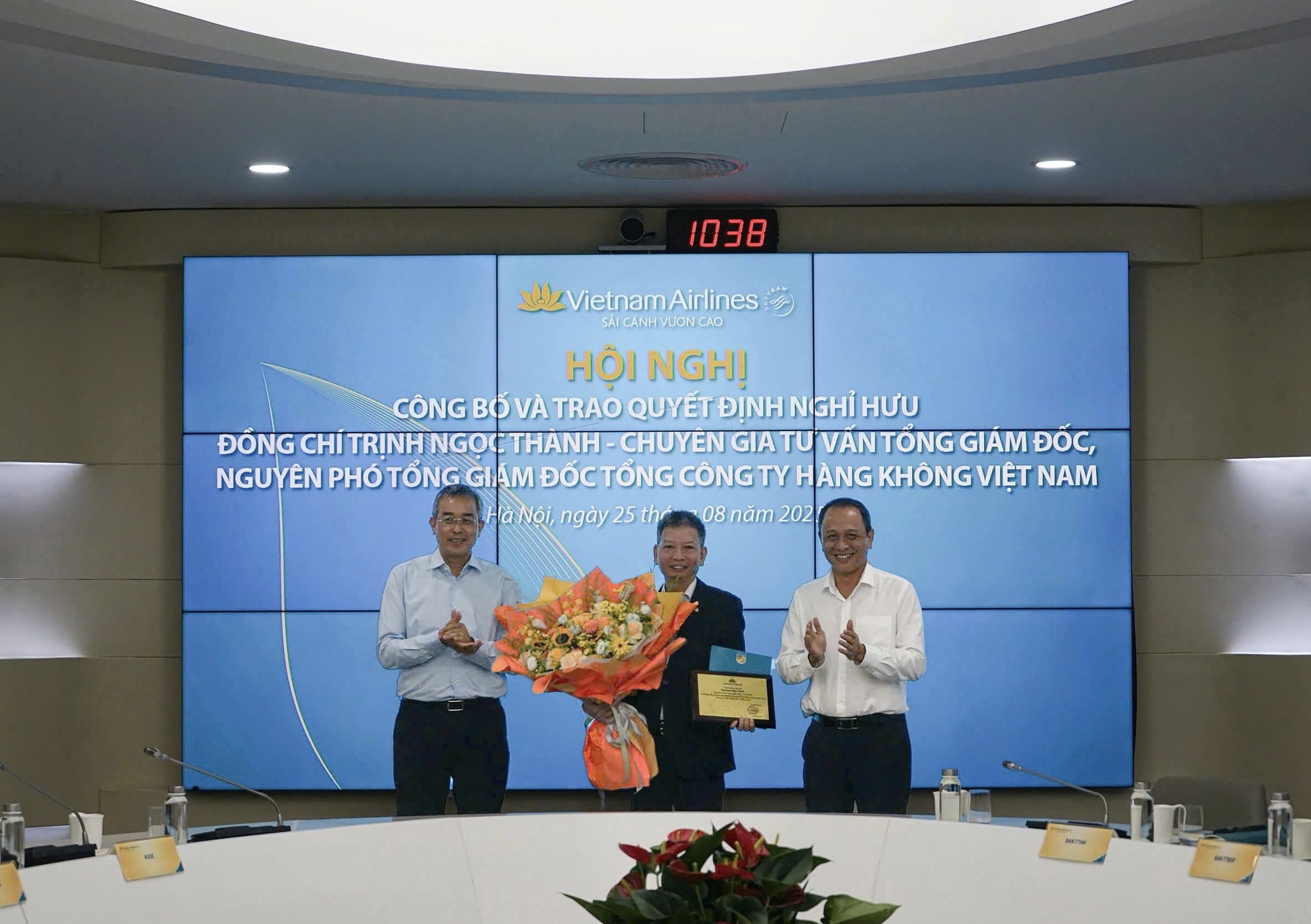 Thay mặt Ban lãnh đạo Tổng công ty, TGĐ Lê Hồng Hà đã trao Quyết định nghỉ hưu và hưởng chế độ hưu trí cho đồng chí Trịnh Ngọc Thành, đồng thời bày tỏ sự tri ân đối với những đóng góp to lớn của đồng chí Trịnh Ngọc Thành trong suốt quá trình gắn bó với Vietnam Airlines.